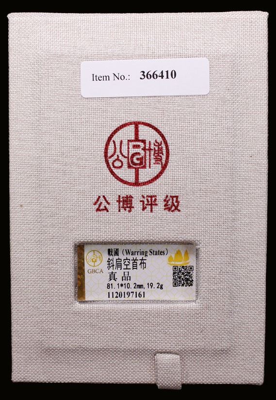 WARRING STATES: State of Zhou, 400-300 BC, AE spade money (19.2g), H-2.170, hollow-handled sloping-shoulder spade money, graded 'Genuine' by GBCA Grading Company, broken tips and casting defects, Fine, ex Ilse & Rolf Braun Collection. Associated with the Kingdom of Zhou and the Henan area.