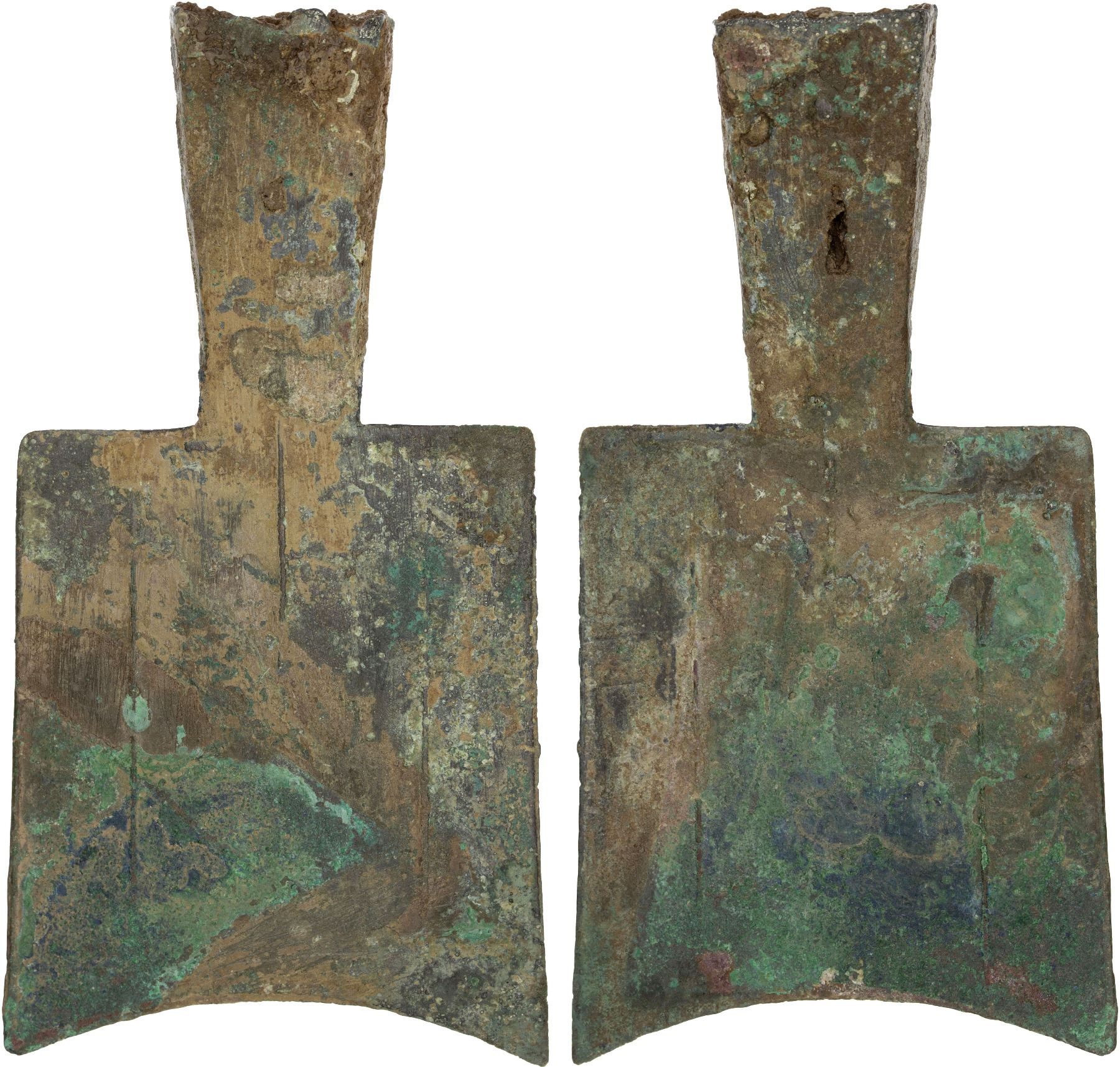 WARRING STATES: State of Zhou, 500-400 BC, AE spade money (16.8g), H-2.130var, hollow-handled square shoulder type, small size, small wu ("five") to left, graded 'Genuine' by GBCA Grading Company, VF, ex Dr. Dirk Löer Collection, ex Beijing Poly Auction 8th Anniversary Spring Auction, Lot 10639 (3788). These types have been found in the area corresponding to the Royal Domain of Zhou (south Hebei and north Henan). Archaeological evidence dates them to the early spring and autumn period, approximately 650 BC and onward.