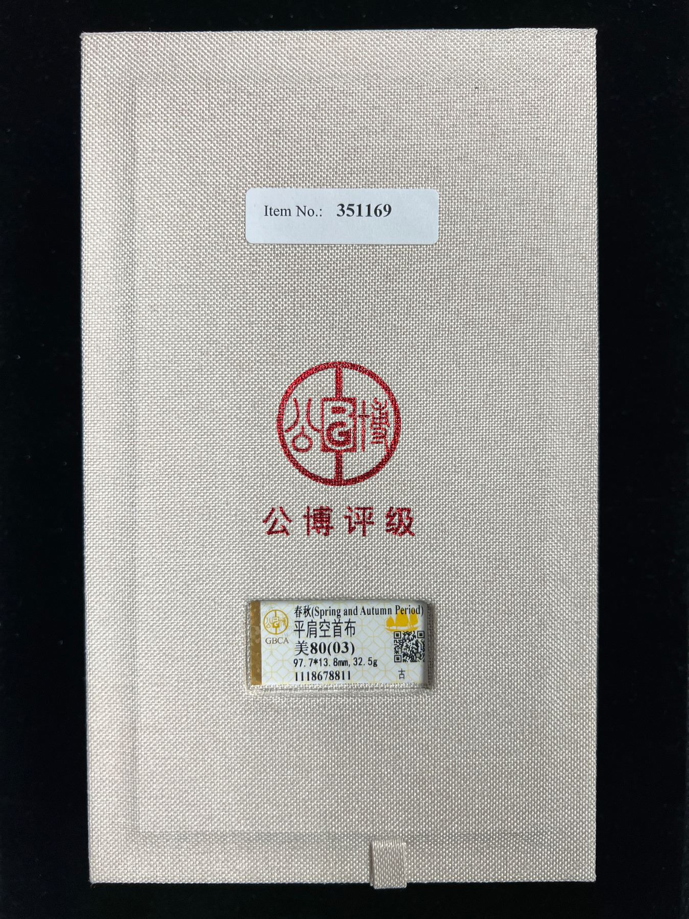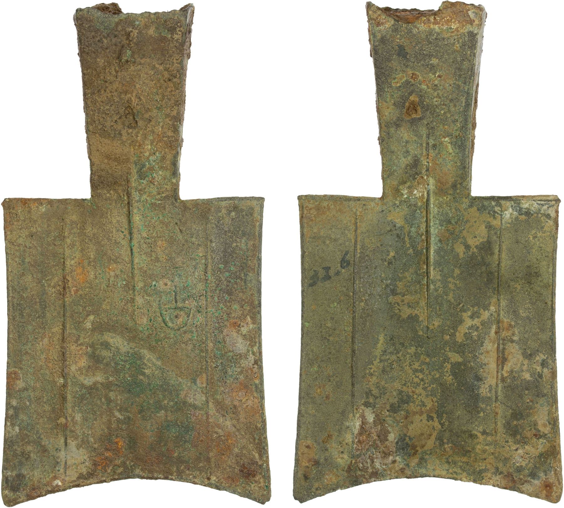 WARRING STATES: State of Zhou, 650-400 BC, AE spade money (32.5g), H-2.45, hollow-handled square shoulder type, large size, ji or gu in archaic script, graded 80(03) by GBCA Grading Company, repaired, weight in ink on reverse, VF, ex Dr. Dirk Löer Collection. These types have been found in the area corresponding to the Royal Domain of Zhou (south Hebei and north Henan). Archaeological evidence dates them to the early spring and autumn period, approximately 650 BC and onward.