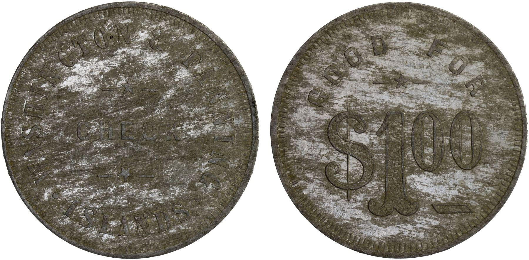 WASHINGTON & FANNING ISLAND: 1 dollar token, ND, TC-106332, N-419911, 38mm aluminum token, CHECK with ornaments above and below with WASHINGTON & FANNING / ISLANDS around // "GOOD FOR / $1.00", with ornaments in fields, variety with rounded letters G and O in GOOD FOR, plain edge, likely struck circa 1910, with flan streaks and field marks as usual, XF. Pierre Joseph Emmanuel Rougier (Father Rougier) acquired a large sum of money in what was known as the Cecille Affair in 1906, and soon afterwards left Fiji and acquired plantation interests at Fanning, Washington and Christmas Islands. In 1907, after obtaining Cecille's fortune, Rougier bought both Fanning Island and Washington Islands for £25,000 and opened a warehouse type store. He had struck 1 dollar, 50 cent, 25 cent and 12½ cent tokens for the native workers who then could spend them only at his store. These tokens were likely ordered and struck in the United States due to the style of manufacture.Rougier, being known as Abbé Rougier, resided in Tahiti and became a prominent figure there in the business and cultural worlds. As he did not live on Fanning or Washington Island, it was necessary to produce tokens; consequently, he did not to have to keep large amounts of cash on hand to pay workers each month. In October 1911, Rougier sold both islands to a Canadian syndicate for £70,000. The Islands are now part of the Republic of Kiribati and known as Tabuaeran (Fanning) and Teraina (Washington) islands.