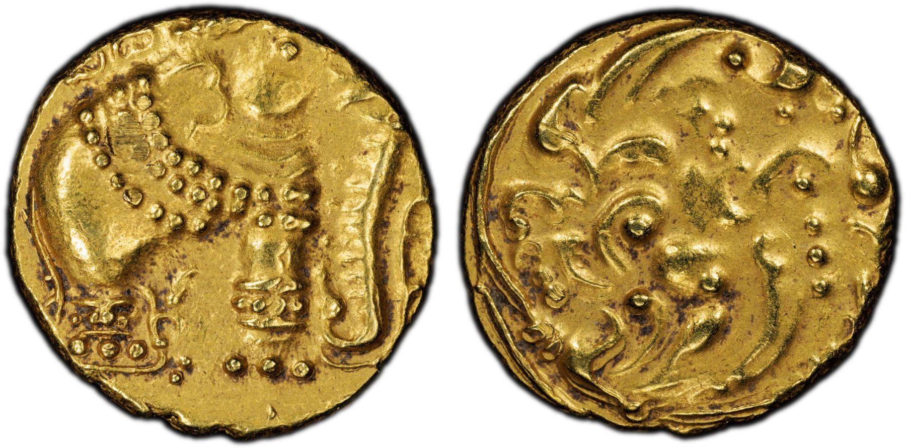 WESTERN GANGAS: Anonymous, ca. 12th-13th century, AV pagoda (3.87g), Mitch-702, Fr-288, caparisoned elephant standing right // whirling floral decoration, a pleasant lustrous example, light scrape, PCGS graded Unc details.
