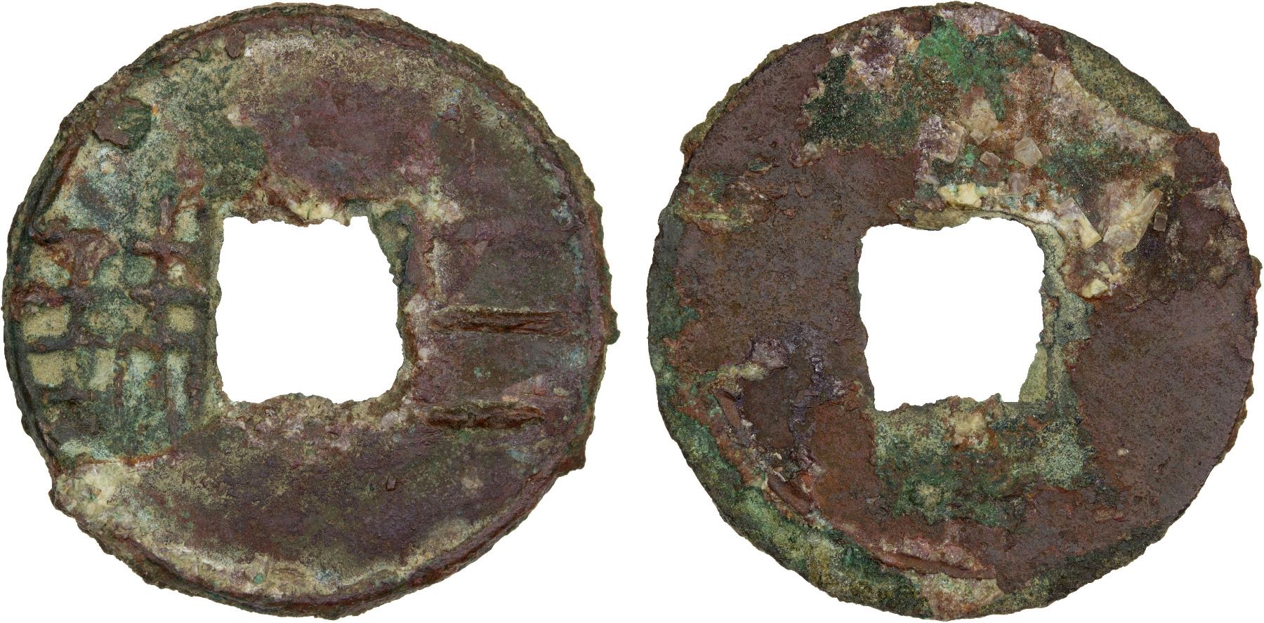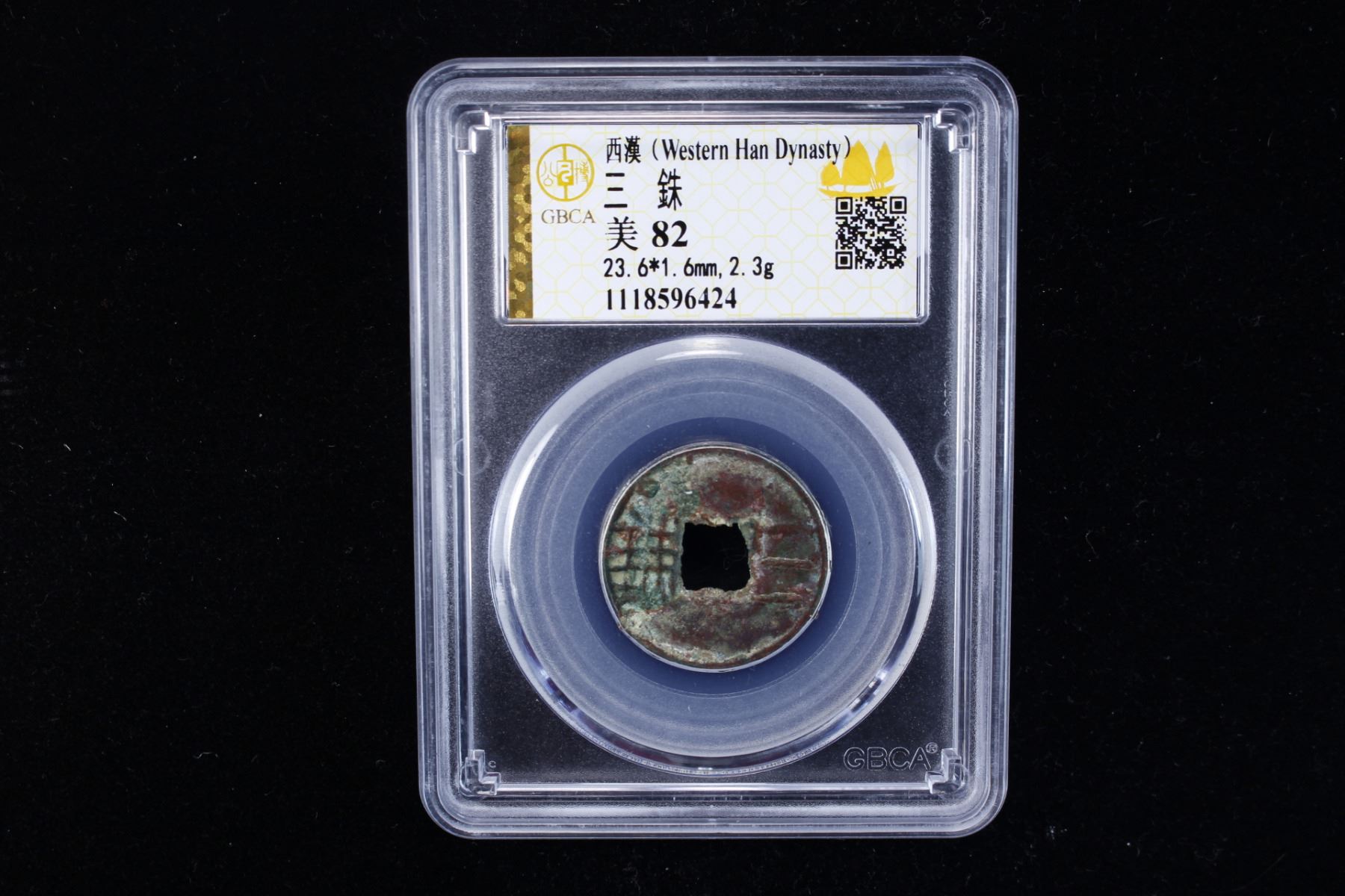 WESTERN HAN: Anonymous, 119-118 BC, AE cash (2.3g), H-8.1, san zhu in archaic script with outer rim, graded 82 by GBCA Grading Company, VF-XF, ex Dr. Dirk Löer Collection. The San Zhu coin was issued either between 140 and 136 BC, or between 119 and 118 BC. The records are ambiguous, but the later date is generally preferred.