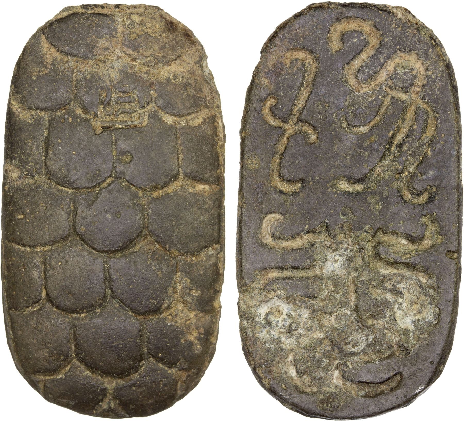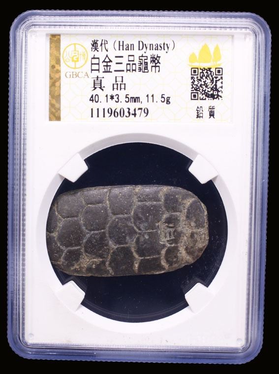 WESTERN HAN: Han Wudi, 141-87 BC, lead 300 zhu (11.5g), Tortoise type of bai jin san ping, with the domed shell of the turtle representing the round sky above and its flat bottom symbolizing the flat earth below in ancient Chinese cosmology, and a square stamp on reverse reading shao or shao fu, graded 'Genuine' by GBCA Grading Company, VF, ex Dr. Dirk Löer Collection. The "Bai Jin San Pin" (White metal three kinds), according to the Records of the Grand Historian, was introduced in 119 BC during the reign of Emperor Wu as both the Han-Xiongnu War and the territorial expansion of the Han Empire caused the imperial government to desperately increase their revenues. Among the reasons why the government started issuing this new type of currency was to remedy the inflation caused by the excessive issuance of bad money, but the Bai Jin San Pin would prove to be an insufficient solution. The Records of the Grand Historian claim that the new "Bai Jin" (white metal) money was a mixture of silver and tin. The term San Pin refers to the fact that it was a series of three coins with different denominations: Dragon 3000 cash coins, Horse 500 cash coins and Tortoise 300 cash coins.