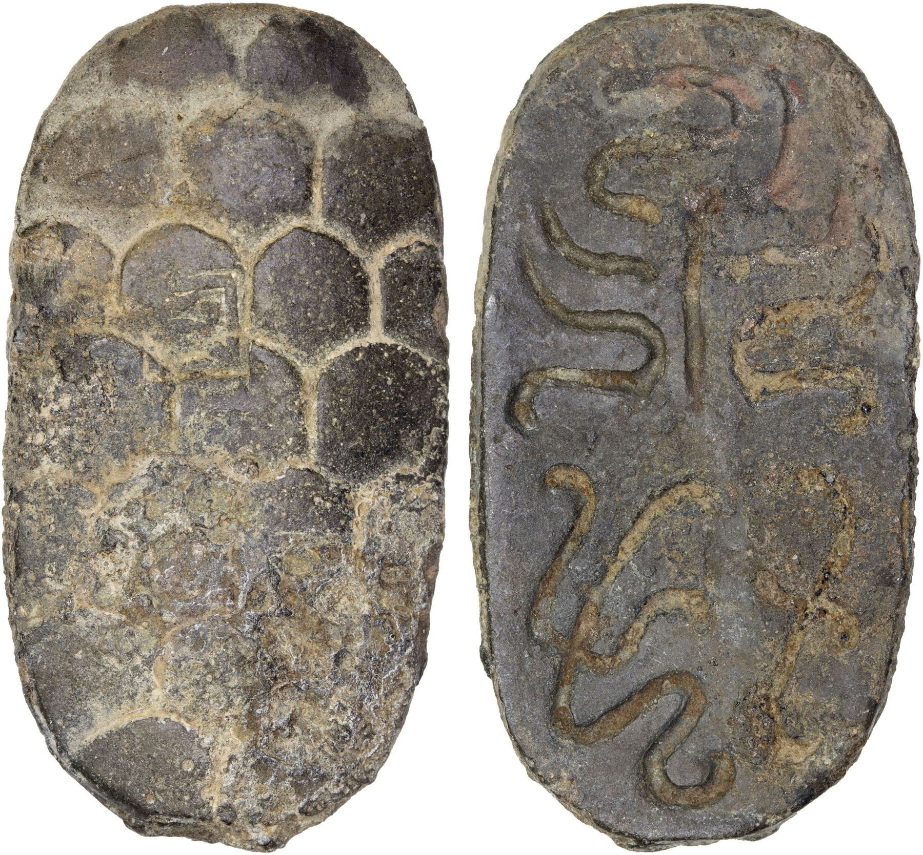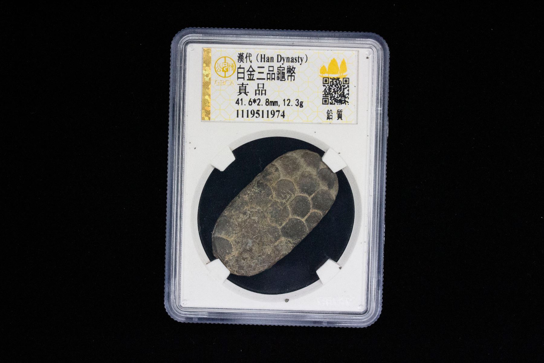WESTERN HAN: Han Wudi, 141-87 BC, lead 300 zhu (12.3g), Tortoise type of bai jin san ping, with the domed shell of the turtle representing the round sky above and its flat bottom symbolizes the flat earth below in ancient Chinese cosmology, and a square stamp on reverse reading shao or shao fu, graded 'Genuine' by GBCA Grading Company, VF, ex Dr. Dirk Löer Collection. The "Bai Jin San Pin" (White metal three kinds), according to the Records of the Grand Historian, was introduced in 119 BC during the reign of Emperor Wu as both the Han-Xiongnu War and the territorial expansion of the Han Empire caused the imperial government to desperately increase their revenues. Among the reasons why the government started issuing this new type of currency was to remedy the inflation caused by the excessive issuance of bad money, but the Bai Jin San Pin would prove to be an insufficient solution. The Records of the Grand Historian claim that the new "Bai Jin" (white metal) money was a mixture of silver and tin. The term San Pin refers to the fact that it was a series of three coins with different denominations: Dragon 3000 cash coins, Horse 500 cash coins and Tortoise 300 cash coins.