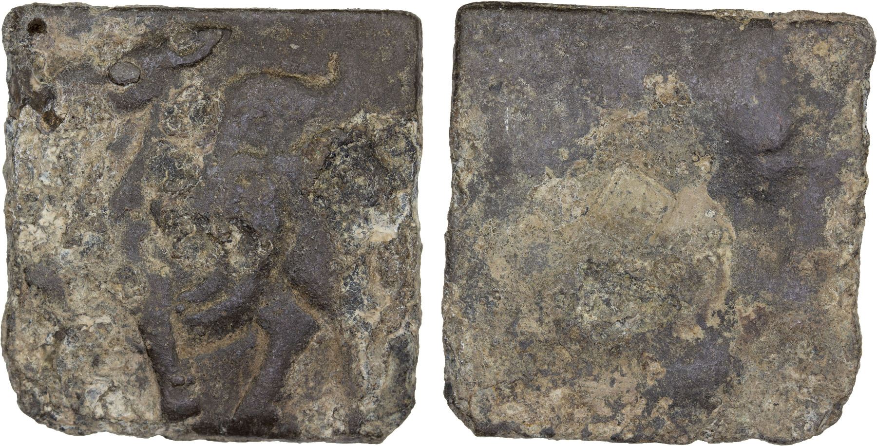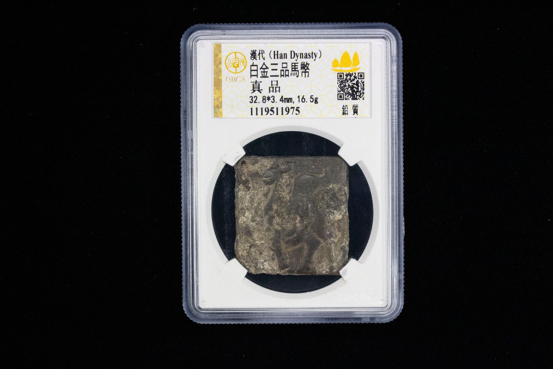 WESTERN HAN: Han Wudi, 141-87 BC, lead 500 zhu (16.5g), Horse type of bai jin san ping, image of a horse with head upright, chest high, with three legs on the ground and one hoof raised, full of vigor and and imposing momentum which represented the square earth, and a square stamp on reverse reading shao or shao fu, graded 'Genuine' by GBCA Grading Company, VF, ex Dr. Dirk Löer Collection. The "Bai Jin San Pin" (White metal three kinds), according to the Records of the Grand Historian, was introduced in 119 BC during the reign of Emperor Wu as both the Han-Xiongnu War and the territorial expansion of the Han Empire caused the imperial government to desperately increase their revenues. Among the reasons why the government started issuing this new type of currency was to remedy the inflation caused by the excessive issuance of bad money, but the Bai Jin San Pin would prove to be an insufficient solution. The Records of the Grand Historian claim that the new "Bai Jin" (white metal) money was a mixture of silver and tin. The term San Pin refers to the fact that it was a series of three coins with different denominations: Dragon 3000 cash coins, Horse 500 cash coins and Tortoise 300 cash coins.