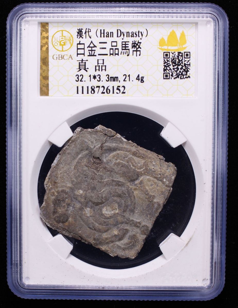 WESTERN HAN: Han Wudi, 141-87 BC, lead 500 zhu (21.4g), Horse type of bai jin san ping, image of a horse with head upright, chest high, with three legs on the ground and one hoof raised, full of vigor and imposing momentum which represented the square earth, and a square stamp on reverse reading shao or shao fu, graded 'Genuine' by GBCA Grading Company, Fine, ex Dr. Dirk Löer Collection. The "Bai Jin San Pin" (White metal three kinds), according to the Records of the Grand Historian, was introduced in 119 BC during the reign of Emperor Wu as both the Han-Xiongnu War and the territorial expansion of the Han Empire caused the imperial government to desperately increase their revenues. Among the reasons why the government started issuing this new type of currency was to remedy the inflation caused by the excessive issuance of bad money, but the Bai Jin San Pin would prove to be an insufficient solution. The Records of the Grand Historian claim that the new "Bai Jin" (white metal) money was a mixture of silver and tin. The term San Pin refers to the fact that it was a series of three coins with different denominations: Dragon 3000 cash coins, Horse 500 cash coins and Tortoise 300 cash coins.