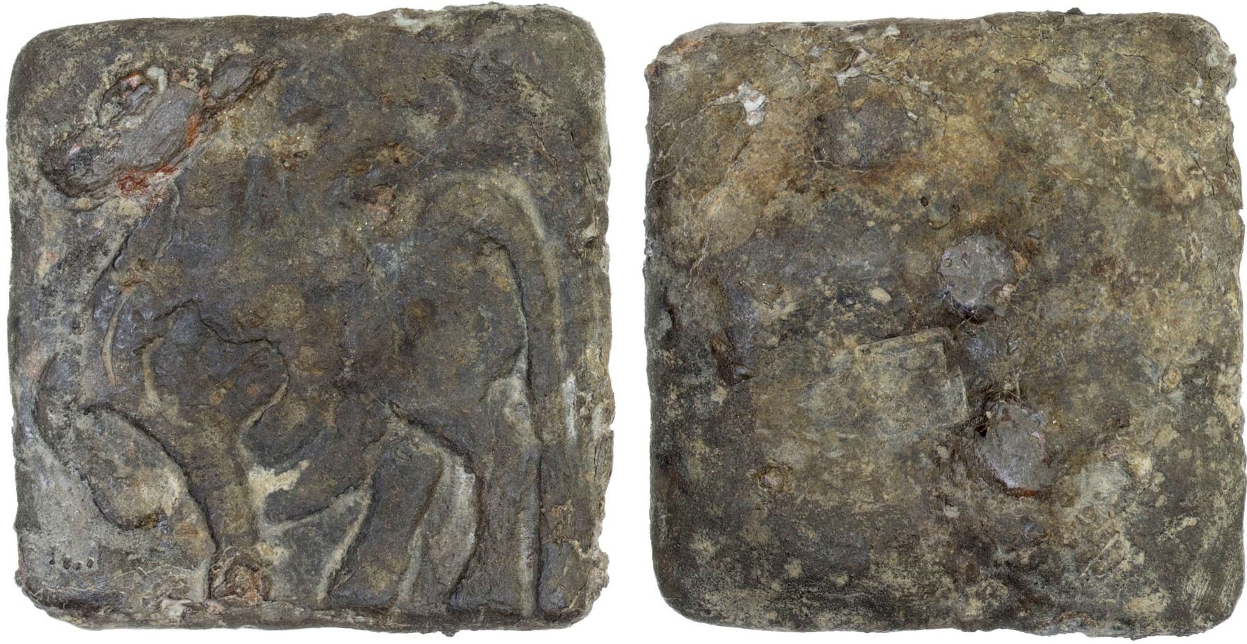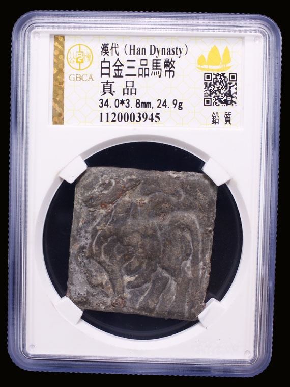 WESTERN HAN: Han Wudi, 141-87 BC, lead 500 zhu (24.9g), Horse type of bai jin san ping, image of a horse with head upright, chest high, with three legs on the ground and one hoof raised, full of vigor and imposing momentum which represented the square earth, and a square stamp on reverse reading shao or shao fu, graded 'Genuine' by GBCA Grading Company, VF, ex Dr. Dirk Löer Collection. The "Bai Jin San Pin" (White metal three kinds), according to the Records of the Grand Historian, was introduced in 119 BC during the reign of Emperor Wu as both the Han-Xiongnu War and the territorial expansion of the Han Empire caused the imperial government to desperately increase their revenues. Among the reasons why the government started issuing this new type of currency was to remedy the inflation caused by the excessive issuance of bad money, but the Bai Jin San Pin would prove to be an insufficient solution. The Records of the Grand Historian claim that the new "Bai Jin" (white metal) money was a mixture of silver and tin. The term San Pin refers to the fact that it was a series of three coins with different denominations: Dragon 3000 cash coins, Horse 500 cash coins and Tortoise 300 cash coins.