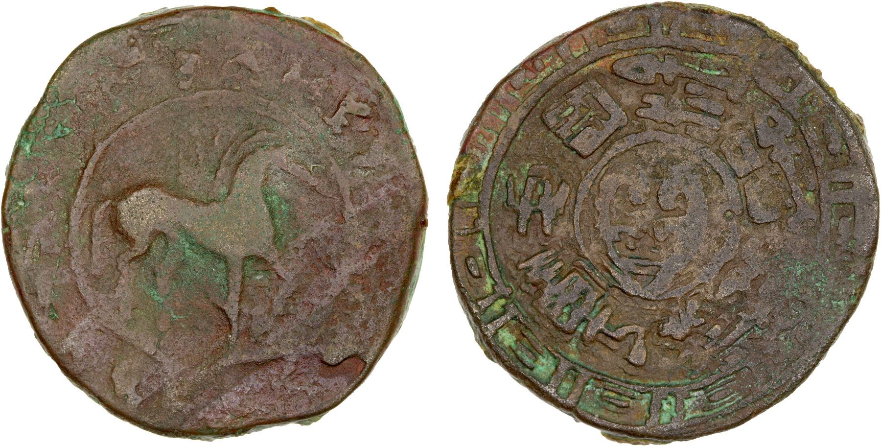 WESTERN HAN: Yutian Kingdom, ca. 2nd-3rd century, AE 24 zhu (16.2g), Cribb-7/8, Sino-Kharosthi series, struck posthumously in the name of Gurgamoya (ca. 30-60 AD), horse right within central circle, traces of Kharosthi legend in the margin // local symbol within central circle, Chinese inscription zhong nian si zhu tong qian ("copper coin weighing 24 zhu") in the margin, and ornate outer border, some porosity, graded 80 by GBCA Grading Company, Fine, ex Dr. Dirk Löer Collection. The Yutian Kingdom was located in the Khotan (Hetian) region in today's southwestern Xinjiang, China. See Cribb's articles in Numismatic Chronicle Volumes 144 & 145 (1984 & 1985).