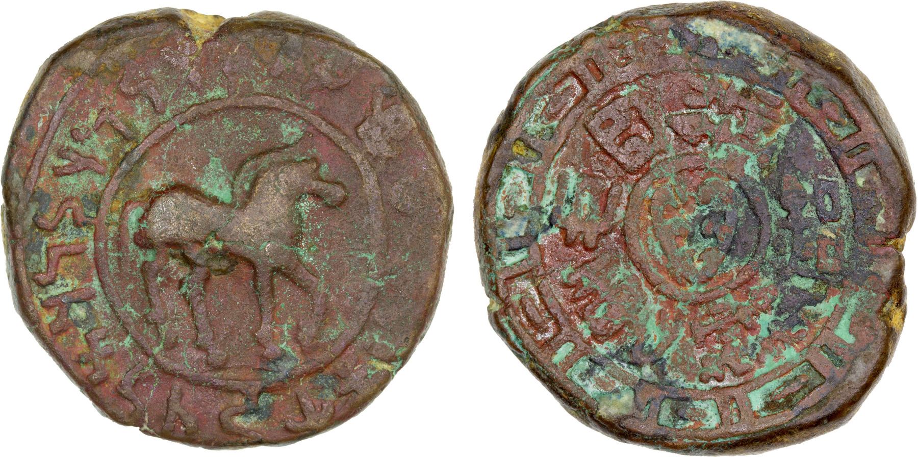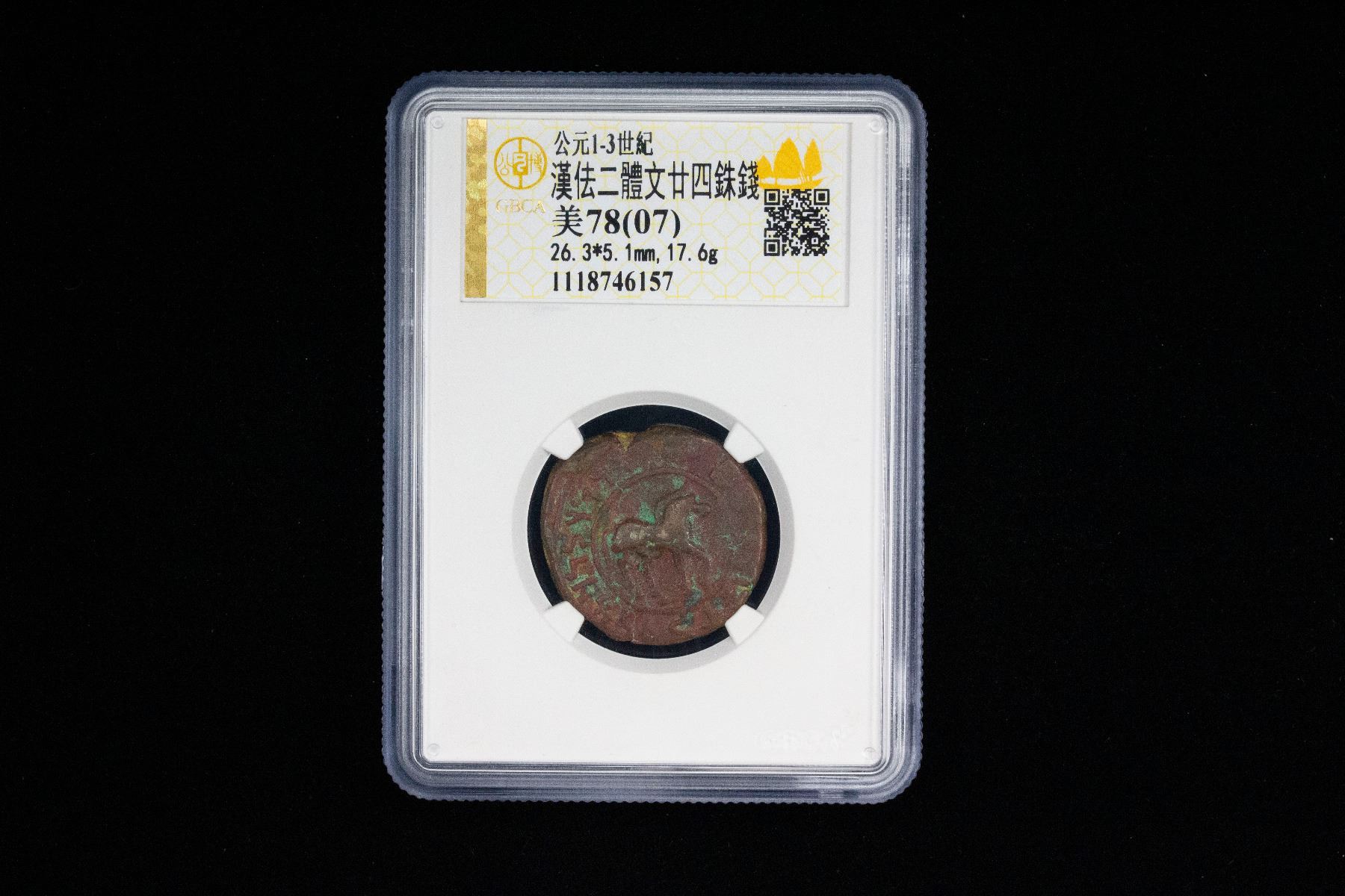 WESTERN HAN: Yutian Kingdom, ca. 2nd-3rd century, AE 24 zhu (17.6g), Cribb-7/8, Sino-Kharosthi series, struck posthumously in the name of Gurgamoya (ca. 30-60 AD), horse right within central circle, much of Kharosthi legend in the margin visible // local symbol within central circle, Chinese inscription zhong nian si zhu tong qian ("copper coin weighing 24 zhu") in the margin, and ornate outer border, graded 78(07) by GBCA Grading Company, natural casting defects, VF, ex Dr. Dirk Löer Collection. The Yutian Kingdom was located in the Khotan (Hetian) region in today's southwestern Xinjiang, China. See Cribb's articles in Numismatic Chronicle Volumes 144 & 145 (1984 & 1985).