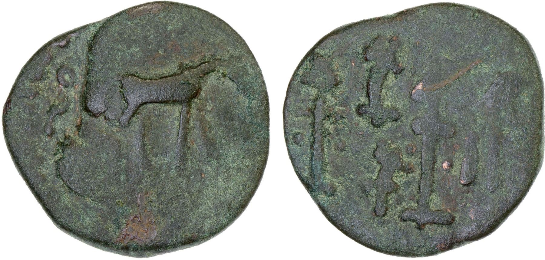 WESTERN HAN: Yutian Kingdom, ca. 2nd-3rd century, AE 6 zhu (3.27g), Cribb-2/5, located in the Khotan region in China: in the name of Gurgamoya, ca. 30-60 AD, but struck later (2nd-3rd century), Sino-Kharosthi series, horse right, Kharosthi legend around // Han Dynasty period Chinese inscription, Chinese character for "6" off flan, Fine, R.