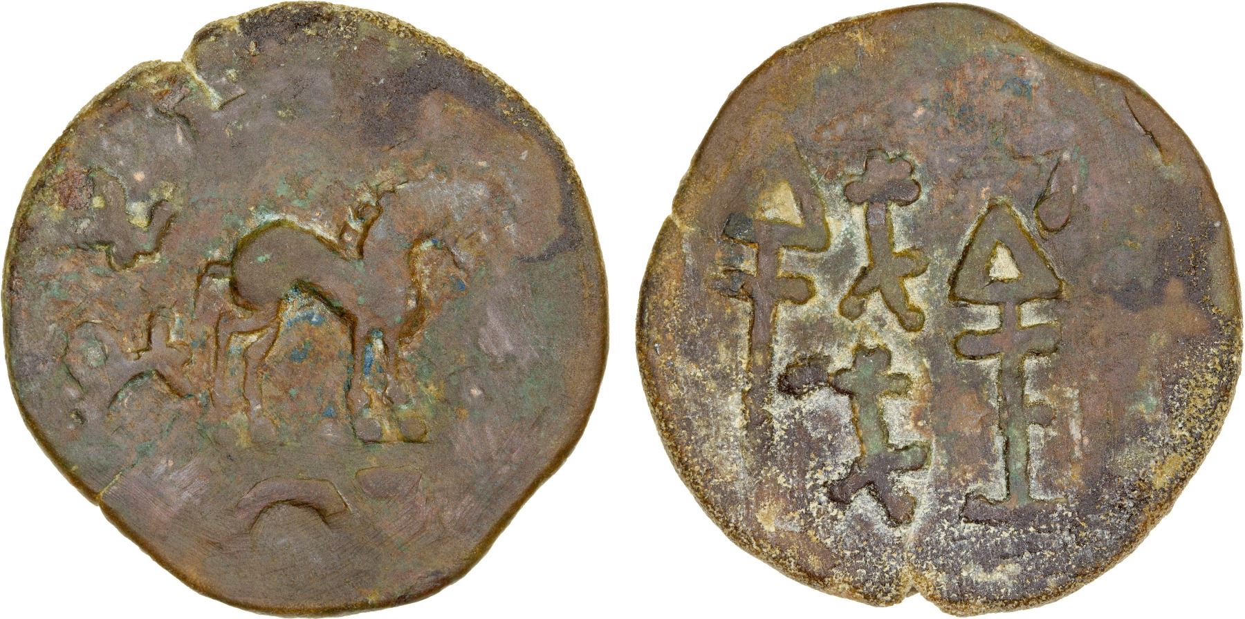 WESTERN HAN: Yutian Kingdom, ca. 2nd-3rd century, AE 6 zhu (4.23g), Cribb-2/5, Sino-Kharosthi series, struck posthumously in the name of Gurgamoya (ca. 30-60 AD), horse right, Kharosthi legend around // Han Dynasty period Chinese inscription, standard Chinese character for "6" above, graded 78(03) by GBCA Grading Company, repaired, F-VF, ex Dr. Dirk Löer Collection. The Yutian Kingdom was located in the Khotan (Hetian) region in today's southwestern Xinjiang, China. See Cribb's articles in Numismatic Chronicle Volumes 144 & 145 (1984 & 1985).