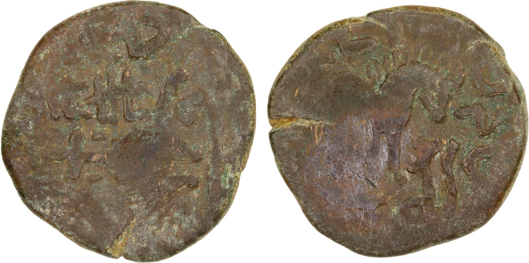 WESTERN HAN: Yutian Kingdom, ca. 2nd-3rd century, AE 6 zhu (4.4g), Cribb-1, Sino-Kharosthi series, struck posthumously in the name of Gurgamoya (ca. 30-60 AD), horse standing right, Kharosthi legend around // Chinese inscription liu zhu qian ("6 zhu currency"), graded 80(05) by GBCA Grading Company, natural flan crack, G-VG, ex Dr. Dirk Löer Collection. The Yutian Kingdom was located in the Khotan (Hetian) region in today's southwestern Xinjiang, China. See Cribb's articles in Numismatic Chronicle Volumes 144 & 145 (1984 & 1985).
