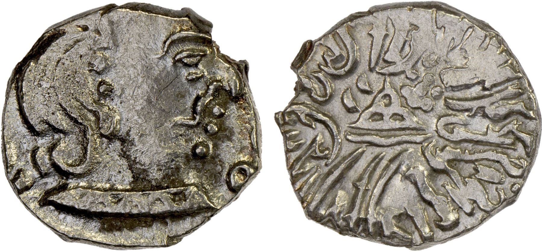 WESTERN KSHATRAPAS: Ja'uka, ca. 403-448, AR drachm (2.12g), Pieper-3428, king's bust, probably undated // hill above river, legend around; the last issue of the Western Kshatrapas, XF, RRR, ex Ian Todd Collection. The latest work by Fishman suggests the name should be red as Jivyaka.