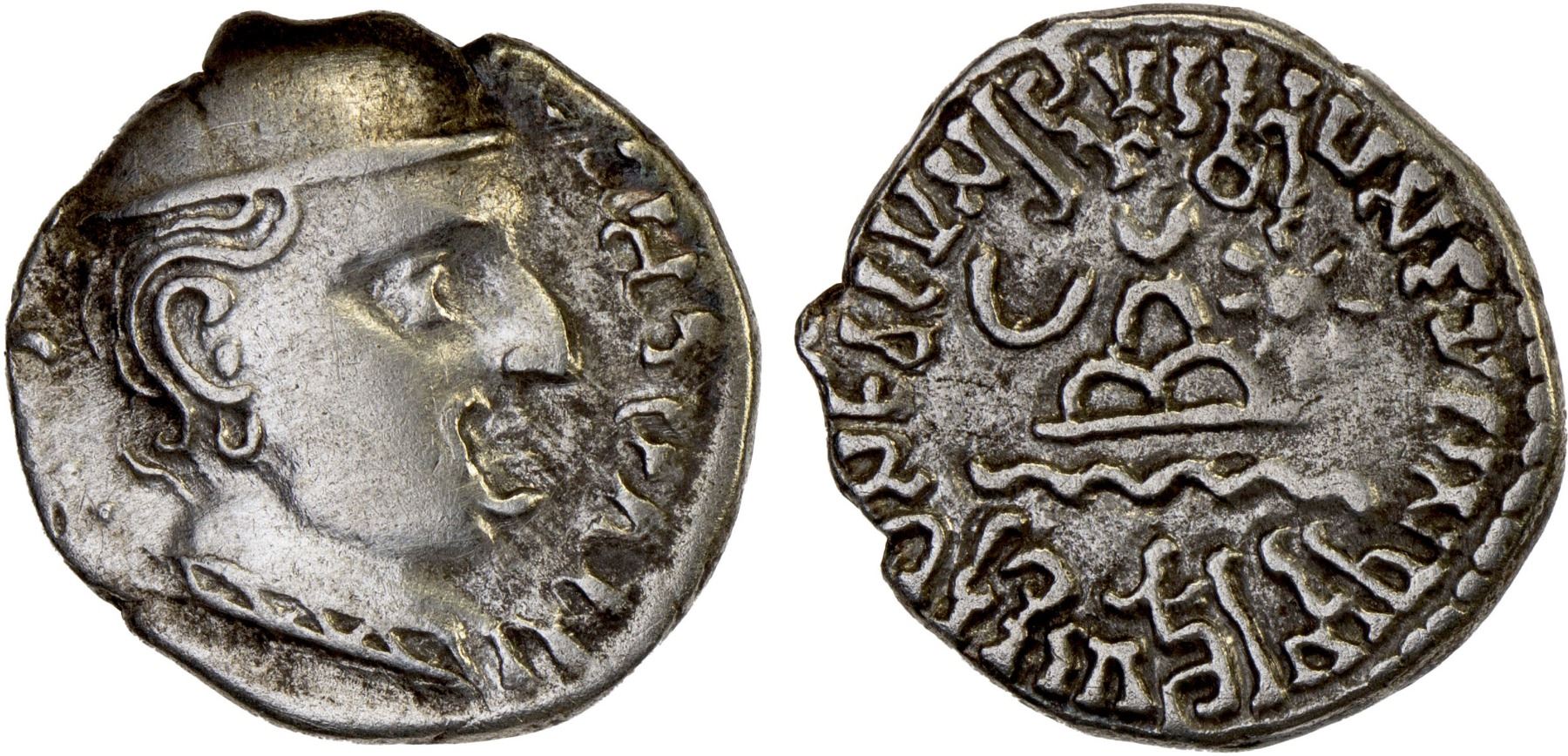 WESTERN KSHATRAPAS: Jivadaman, 197-199, AR drachm (1.91g), Pieper-3378, type A: king's bust right // hill above river, sun & crescent, Brahmi legend around ending is jivadamasa; very weak date, either SE120 or 121, VF-XF, RRR, ex Ian Todd Collection.