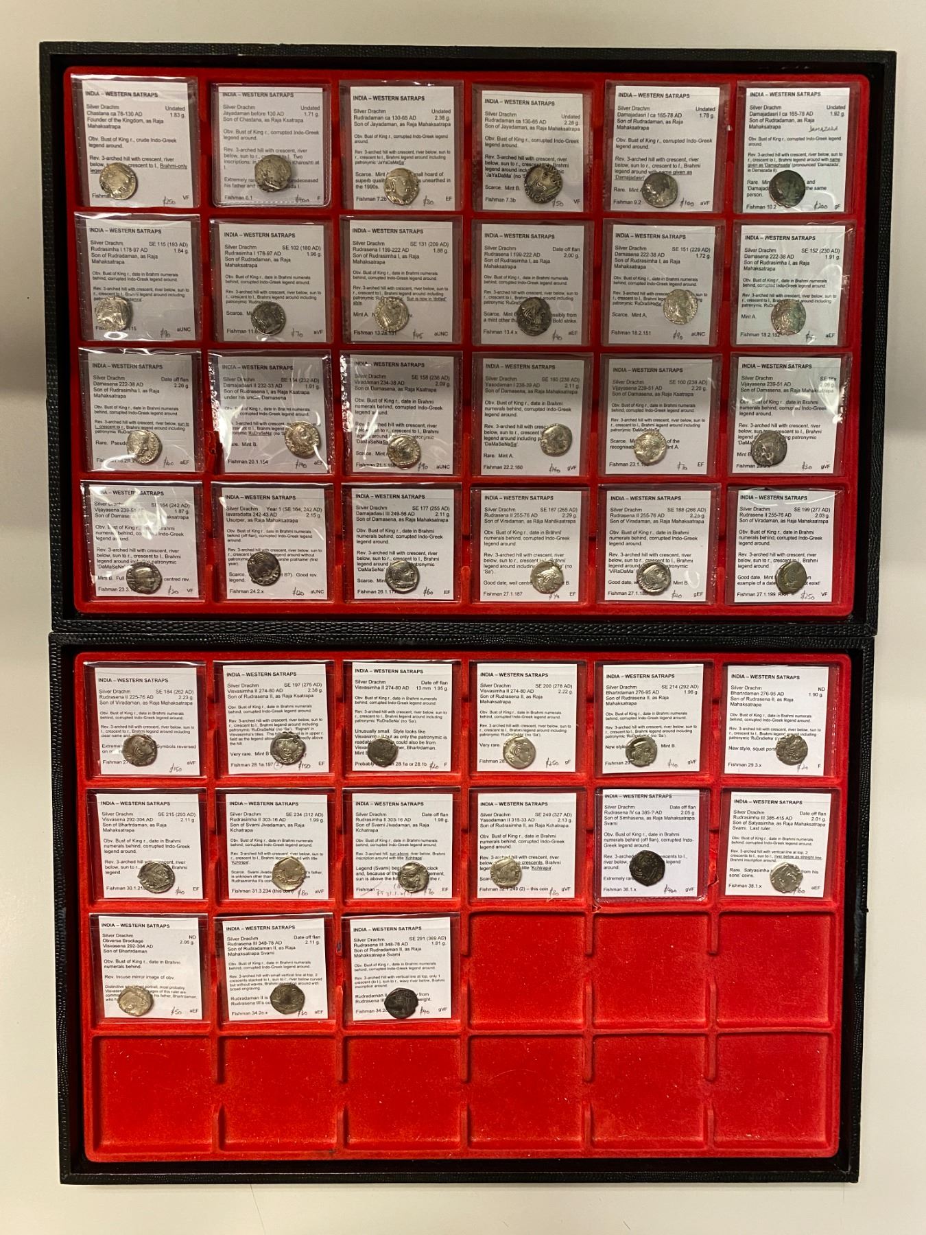 WESTERN KSHATRAPAS: LOT of 39 silver drachms, including Chastana, 78-130 AD (1 pc), Jayadaman, before 130 (1, chipped and corroded), Rudradaman, 130-165 (2), Damajadasri, 165-178 (2, VG & Fine), Ramasimha I, 165-197 (2), Rudrasena I, 198-222 (2), Damasena, 222-238 (3), Damajadasri II, 232-234 (1, F-VF), Viradaman, 234-238 (1), Yasodaman I, 238-239 (1, porous surfaces), Vijayasena, 238-251 (3), Isvarasana, 242-243 (1), Damajadasri III, 249-256 (1), Rudrasena II, 255-276 (4), Visvasimha II, 276-280 (3), Bhartrdaman, 276-295 (2), Visvasena, 292-304 (1), Rudrasimha II, 303-316 (2), Yasodaman II, 315-333 (1), Rudrasena III, 348-378 (2), Rudrasena IV, ca. 385-? (1), Rudrasimha III, 385-415 (1), and a brockage assigned to Visvasena (1); mostly VF condition, with some of the later example VF-EF or EF (grade noted for the rare items in lower condition); all with full identification by the consignor; retail value $1000, lot of 39 pieces, ex Ian Todd Collection.