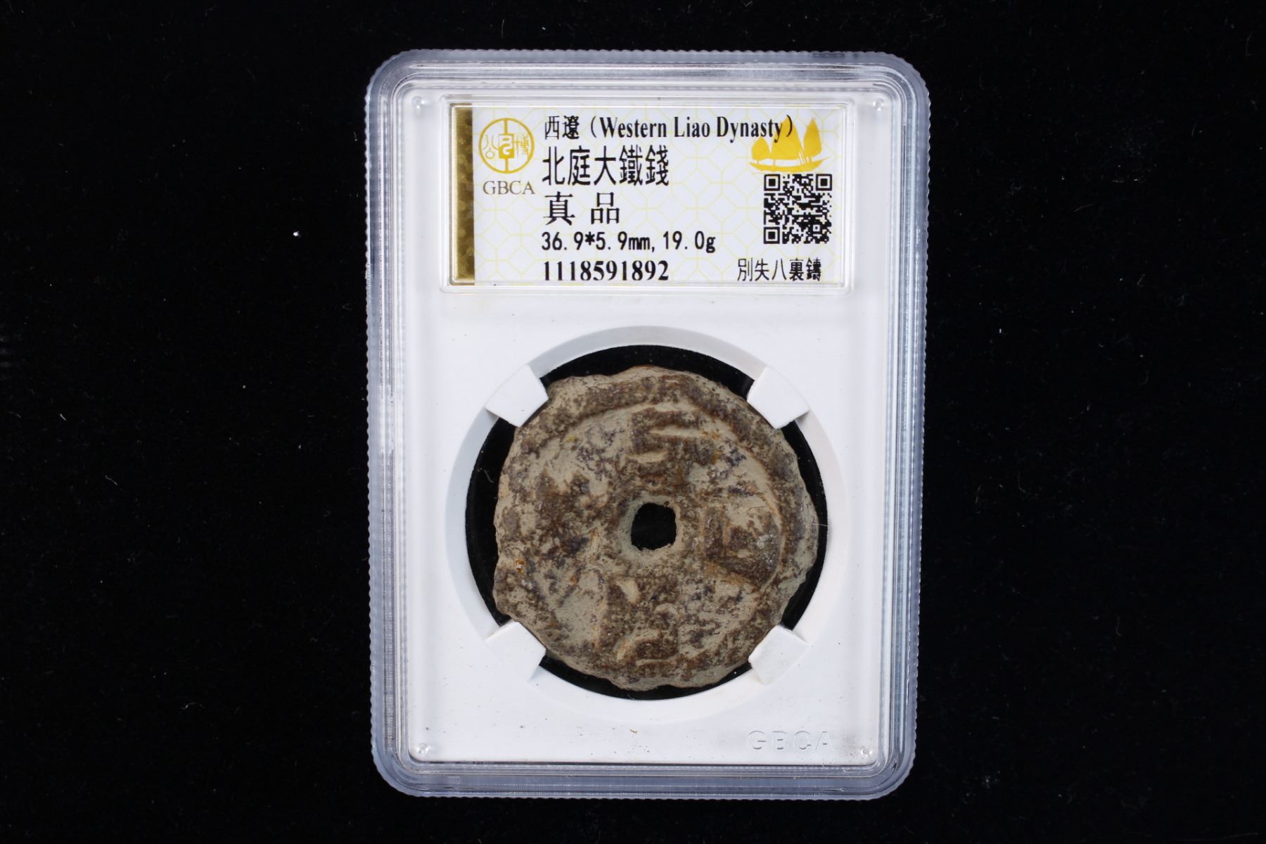 WESTERN LIAO: Anonymous, 1128-1218, iron large cash (19.0g), Zeno-18589, "Beiting Big Iron Money", undeciphered script, graded 'Genuine' by GBCA Grading Company, Fine, ex Hans Mondorf Collection. Beiting Big Iron Money (Bei tíng dà tie qián), also known as "Xiliao Big Iron Money", is named because it is mainly unearthed near the site of the former city of Beiting in Jimusar County, Xinjiang, China. The script on this coin is possibly Tocharian. During the 6th to 9th centuries this script (derived from the Indo-European Brahmi alphabet) was in use at sites as Kucha, Turfan, and Karashar (Xinjiang). It is also possible that the script is Kidan (Qidan). More research on this rare type is needed which is tentatively assigned to the Western Liao. The ancient city of Beiting was the headquarters of the Beiting Protectorate during the 8th century. It was later known as Beshbalik (Beshbaliq) and became one of the capitals of the Uyghur Khaganate and then the Kingdom of Qocho (Kara-Khoja), the later which became a Western Liao vassal state in 1128 during the reign of Bilge Tekin.