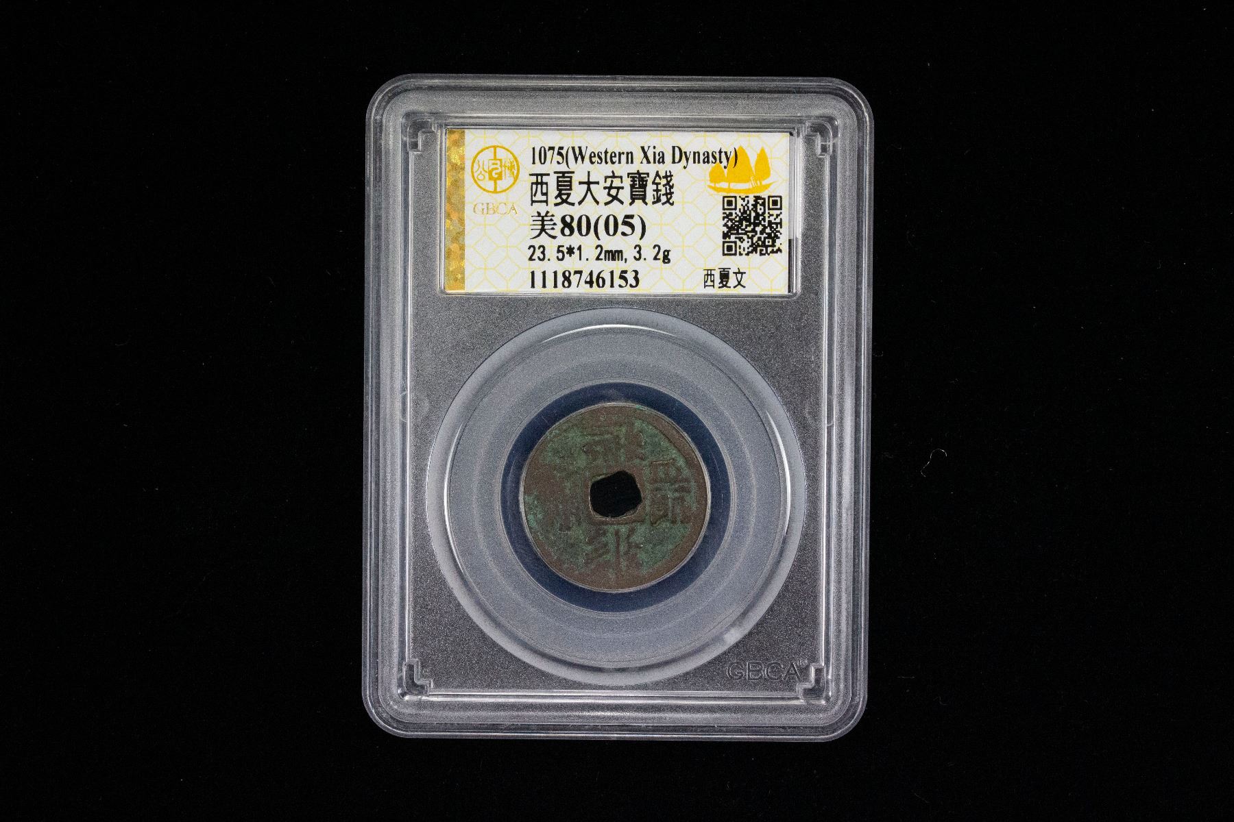 WESTERN XIA: Da An, 1068-1086, AE cash (3.2g), H-18.91, t-ha-h ray lee ndzen in Tangut script (da an bao qian in Chinese), Graded 80(05) by GBCA Grading Company, natural flan crack, F-VF, ex Dr. Dirk Löer Collection. The Tangut script (xi xià wén) was a logographic writing system, used for writing the extinct Tangut language of the Western Xia Dynasty. Tangut characters are similar in appearance to Chinese characters, with the same type of strokes, but the methods of forming characters in the Tangut writing system are significantly different from those of forming Chinese characters. There are only five coin types in Tangut script and all are very rare.