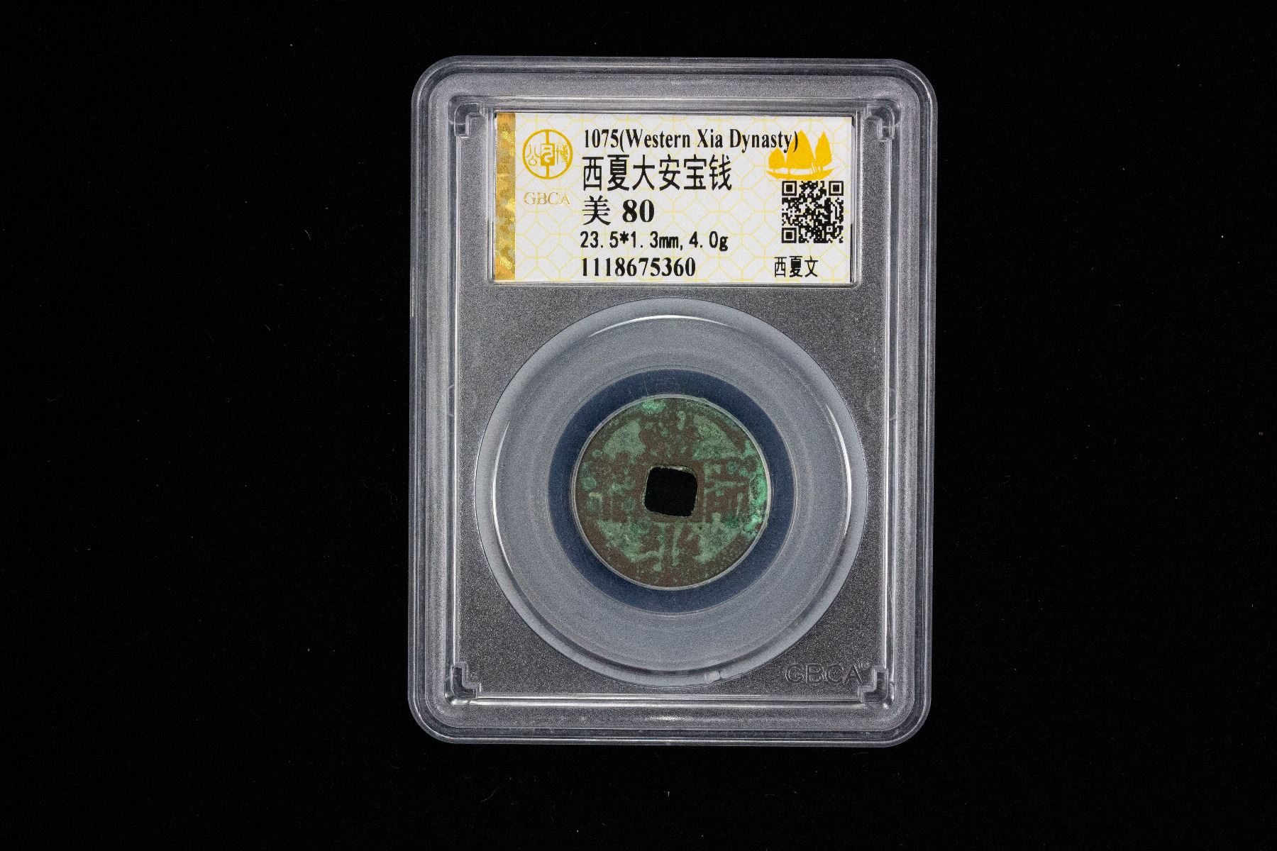 WESTERN XIA: Da An, 1068-1086, AE cash (4.0g), H-18.91, t-ha-h ray lee ndzen in Tangut script (da an bao qian in Chinese), Graded 80 by GBCA Grading Company, Fine, ex Dr. Dirk Löer Collection. The Tangut script (xi xià wén) was a logographic writing system, used for writing the extinct Tangut language of the Western Xia Dynasty. Tangut characters are similar in appearance to Chinese characters, with the same type of strokes, but the methods of forming characters in the Tangut writing system are significantly different from those of forming Chinese characters. There are only five coin types in Tangut script and all are very rare.