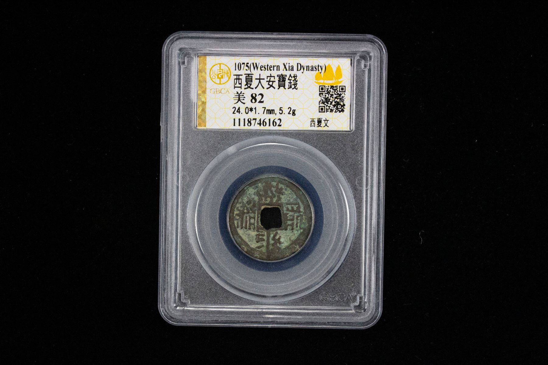 WESTERN XIA: Da An, 1068-1086, AE cash (5.2g), H-18.91, t-ha-h ray lee ndzen in Tangut script (da an bao qian in Chinese), Graded 82 by GBCA Grading Company, VF, ex Dr. Dirk Löer Collection, ex Beijing Poly international Auction, Item 1124. The Tangut script (xi xià wén) was a logographic writing system, used for writing the extinct Tangut language of the Western Xia Dynasty. Tangut characters are similar in appearance to Chinese characters, with the same type of strokes, but the methods of forming characters in the Tangut writing system are significantly different from those of forming Chinese characters. There are only five coin types in Tangut script and all are very rare.