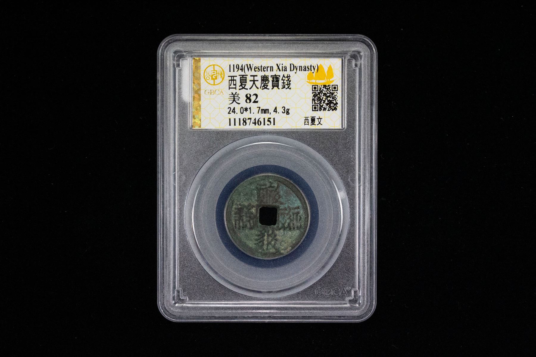 WESTERN XIA: Tian Qing, 1194-1206, AE cash (4.3g), H-18.105, ng-goor lee-oo-h lee ndzen in Tangut script (tian qing bao qian in Chinese), Graded 82 by GBCA Grading Company, VF-XF, ex Dr. Dirk Löer Collection. The Tangut script (xi xià wén) was a logographic writing system, used for writing the extinct Tangut language of the Western Xia Dynasty. Tangut characters are similar in appearance to Chinese characters, with the same type of strokes, but the methods of forming characters in the Tangut writing system are significantly different from those of forming Chinese characters. There are only five coin types in Tangut script and all are very rare.