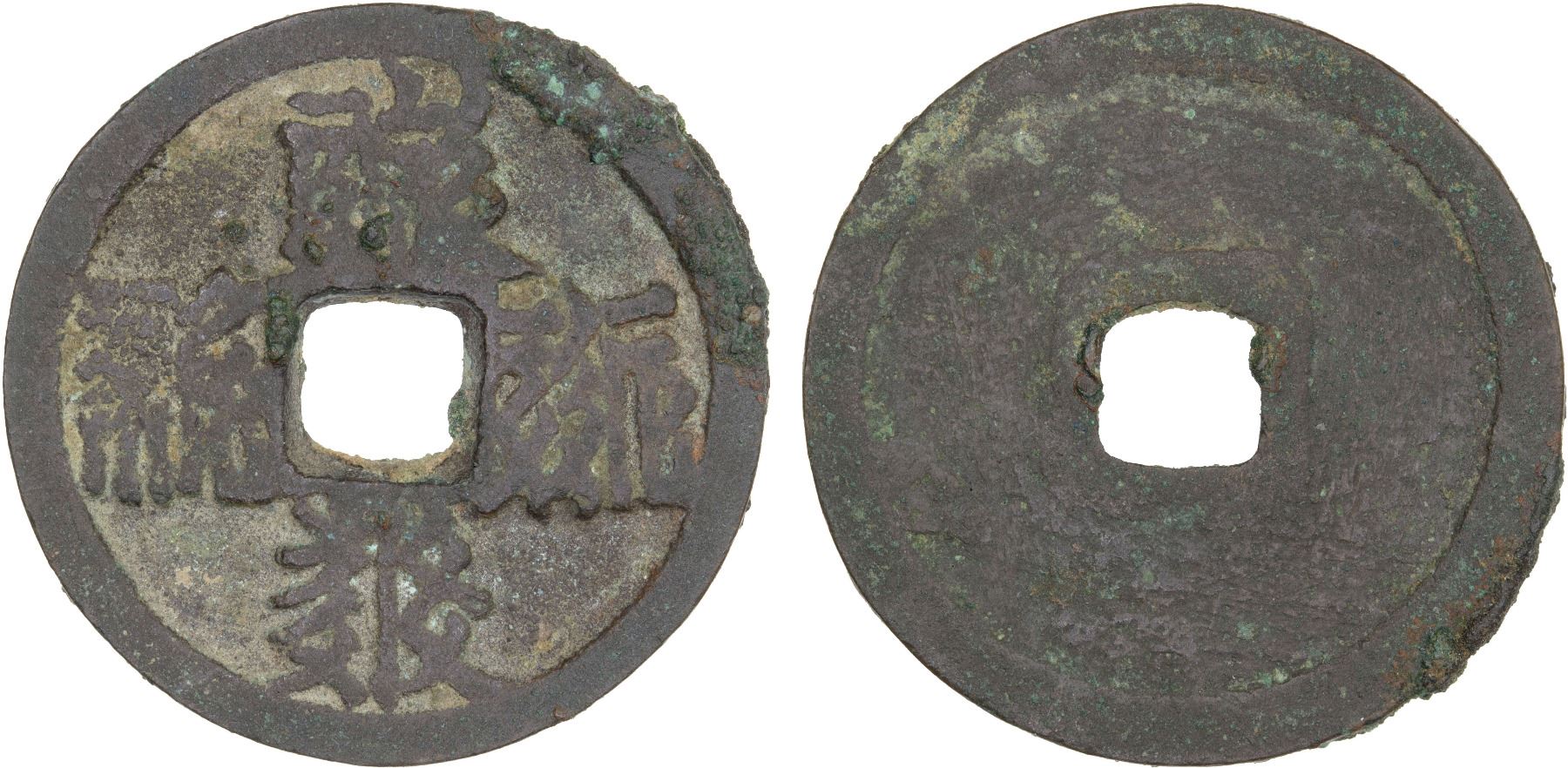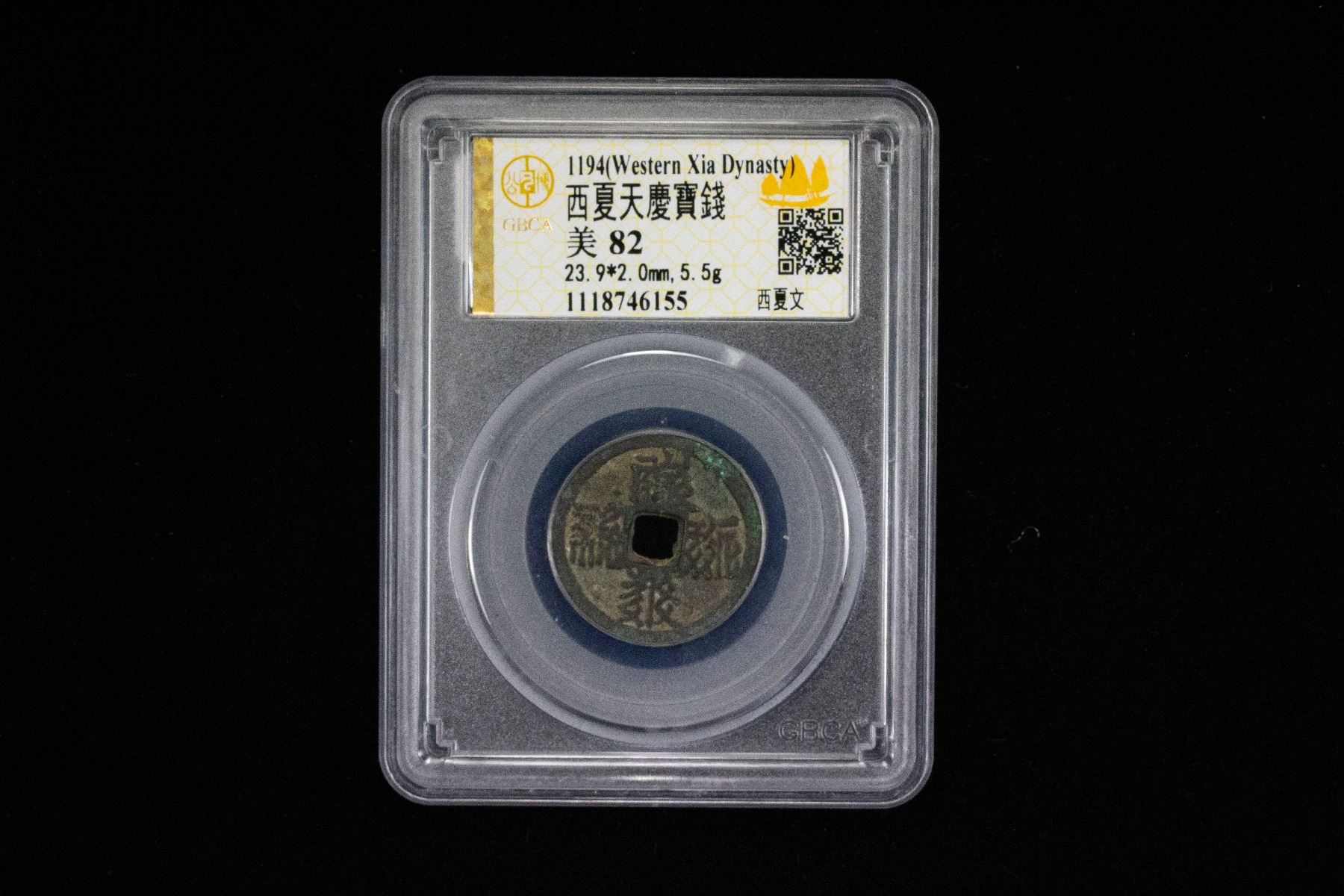 WESTERN XIA: Tian Qing, 1194-1206, AE cash (5.5g), H-18.105, ng-goor lee-oo-h lee ndzen in Tangut script (tian qing bao qian in Chinese), Graded 82 by GBCA Grading Company, VF, ex Dr. Dirk Löer Collection. The Tangut script (xi xià wén) was a logographic writing system, used for writing the extinct Tangut language of the Western Xia Dynasty. Tangut characters are similar in appearance to Chinese characters, with the same type of strokes, but the methods of forming characters in the Tangut writing system are significantly different from those of forming Chinese characters. There are only five coin types in Tangut script and all are very rare.