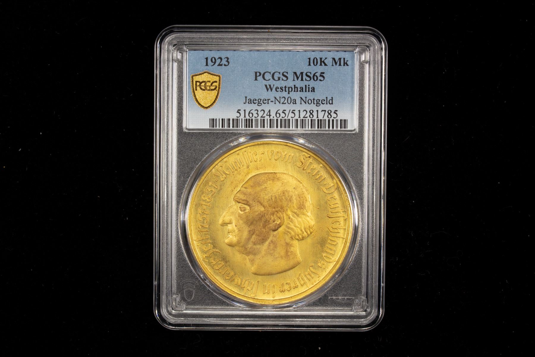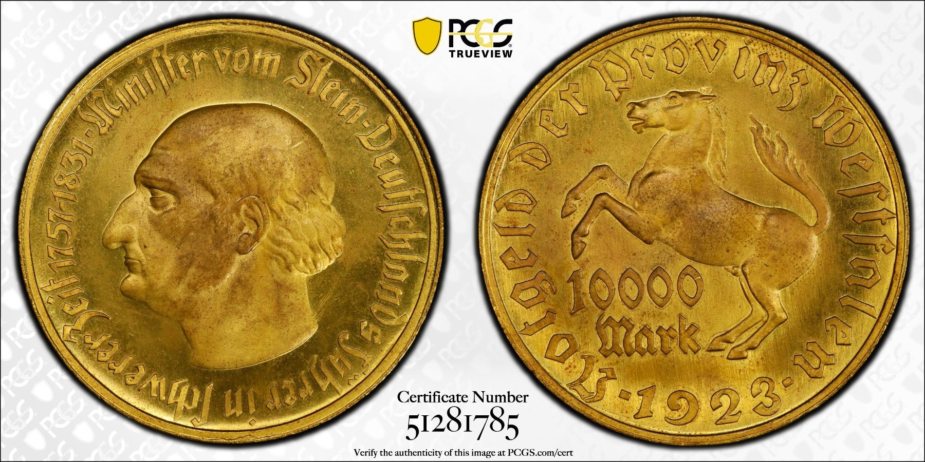 WESTPHALIA: 10,000 mark, 1923, J-N20a, gilt notgeld, the Saxon Steed from the Province of Westphalia // Heinrich Friedrich Karl vom und zum Stein portrait, with original box and certificate of issue, a superb quality example! PCGS graded MS65.