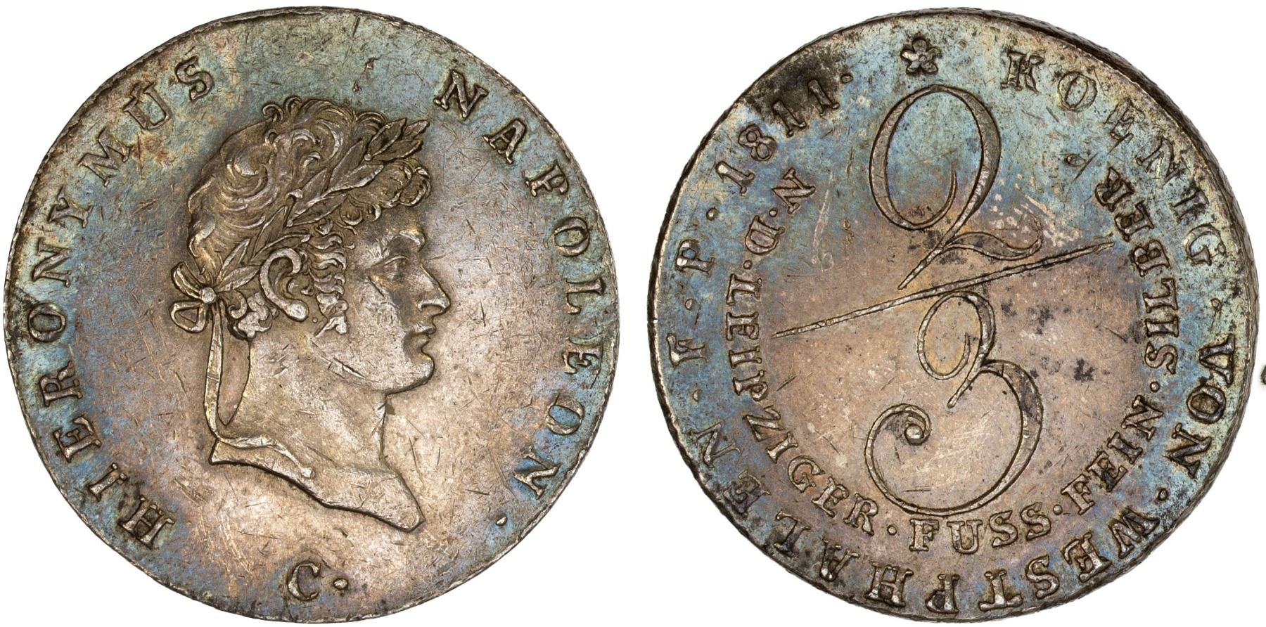 WESTPHALIA: Jerome Napoleon, 1807-1813, AR 2/3 thaler, 1811, KM-117, Cr-9, some contact marks, oxidation spot near reverse rim, beautiful album toning, XF, ex Almer H. Orr III Collection.