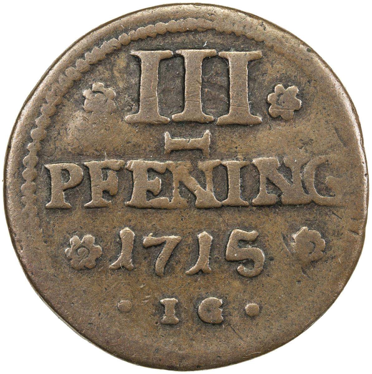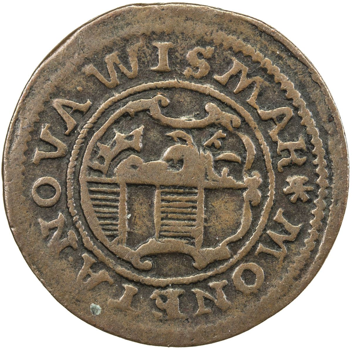 WISMAR: AE 3 pfennig (2.29g), 1715, KM-1, Fine to VF, RR. Struck during the siege of Wismar by the Hannoverians and Danes, which commenced in June 1715 and ended with the surrender and Swedish loss of Wismar in April 1716, though Wismar was recovered by the Swedes, who controlled the city until 1803.
