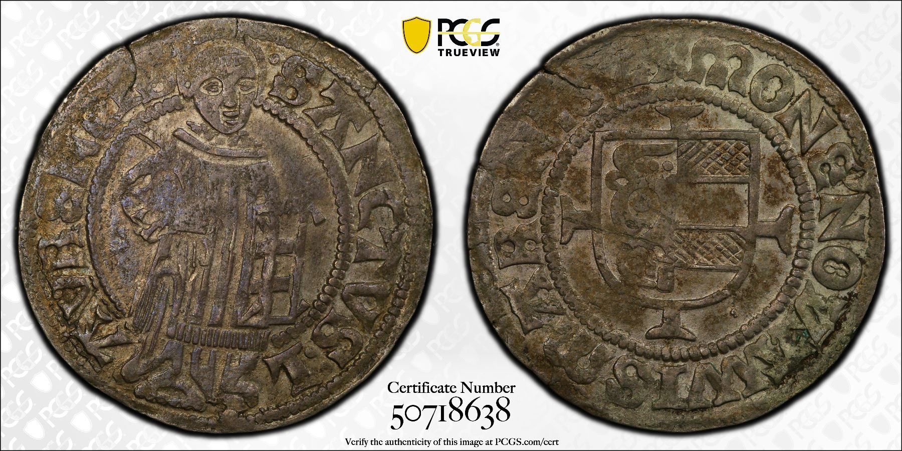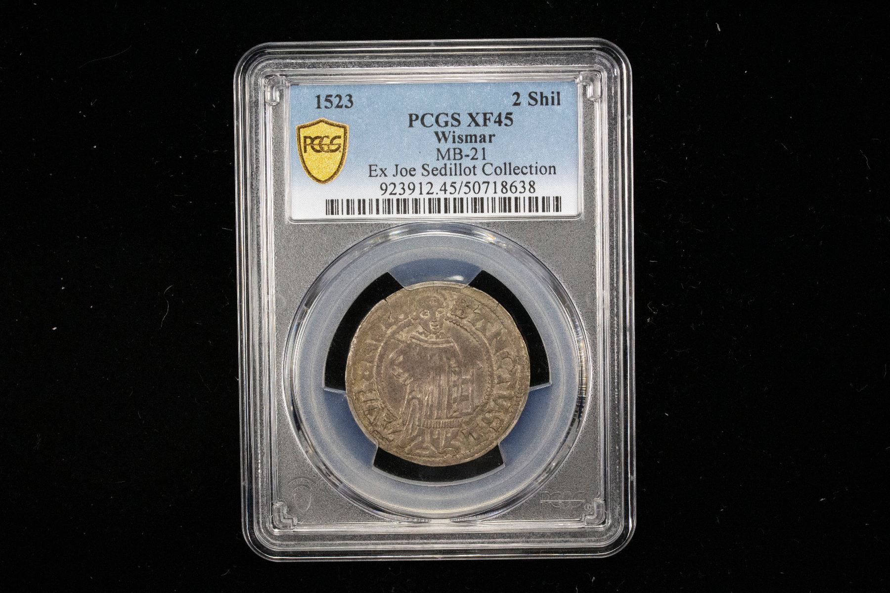 WISMAR: Free Hanseatic City, AR 2 schilling, 1523, Schult-3629, MB-21, Kunkel-42a, a well struck example with traces of original luster, PCGS graded EF45, ex Joe Sedillot Collection. The exact date of the city's foundation is not clear. In the oldest existing document of Wismar of 1229 its civic rights are already established. In 1301 Wismar came under the rule of the House of Mecklenburg. In 1259 Wismar joined a defensive agreement with Lübeck and Rostock, in order to effectively counter the numerous Baltic pirates. Subsequently more cities of the northern Holy Roman Empire would agree to cooperate as commerce and trade was increasingly coordinated and regulated. These policies would provide the basis for the development of the Hanseatic League. By the 13th and 14th centuries Wismar had grown into a flourishing Hanseatic trading hub and an important center of wool processing. Although around 2,000 of its inhabitants perished during the plague of 1376, the town remained reasonably prosperous until the 16th century.