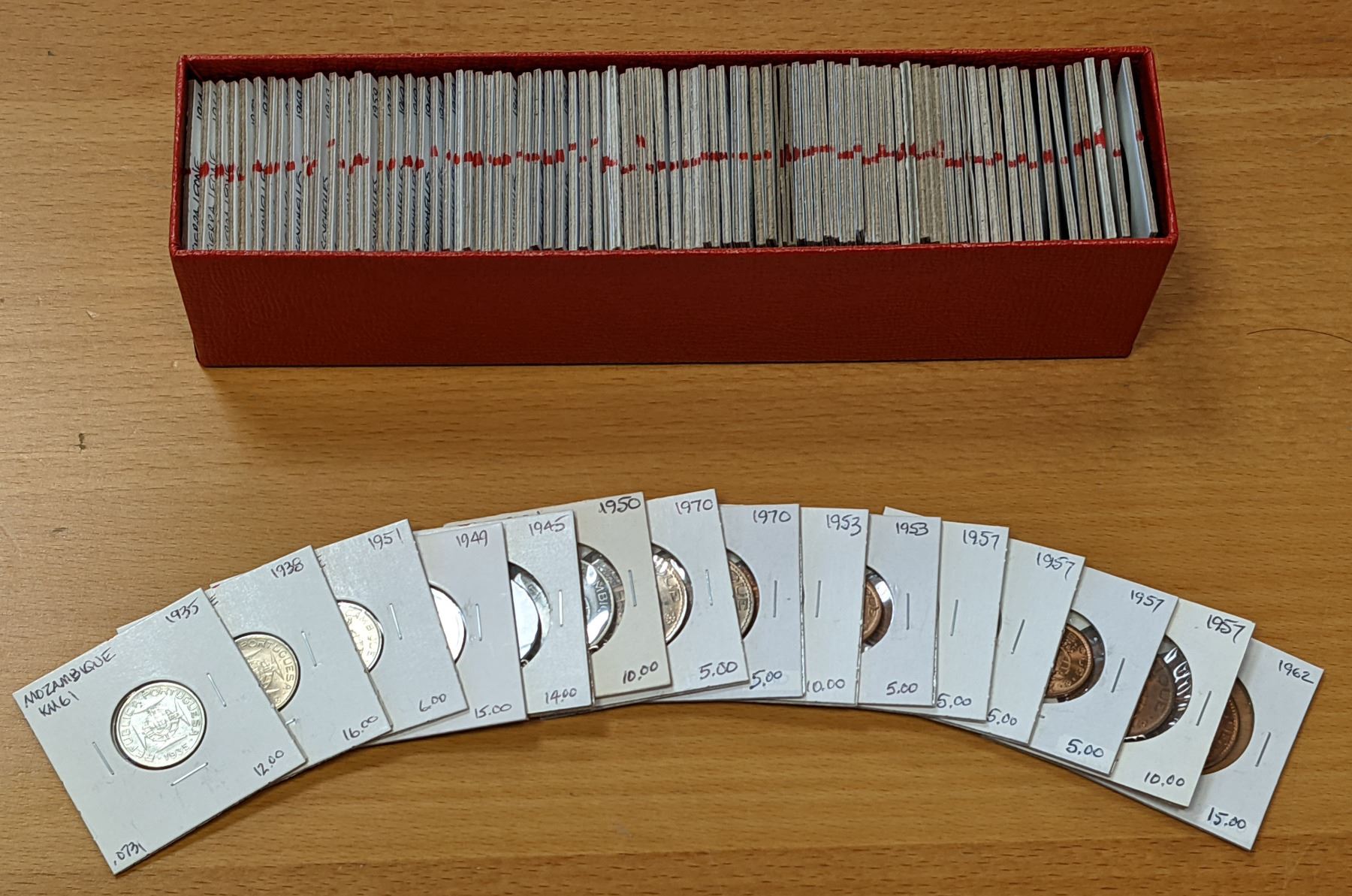WORLDWIDE: AFRICA:LOT of 104 diverse African coins, including Mozambique (34 pcs), Nigeria (13), Portuguese Guinea (3), Reunion (4), Rhodesia (1), Rhodesia & Nyasaland (2), Rwanda (4), St. Thomas & Prince (6), Seychelles (34), and Sierra Leone (3); average circulated grades, with many Uncs and a few proofs, some unusual types, some silver, in consignor's 2x2 holders, viewing recommended; retail value $575, lot of 104 pieces.