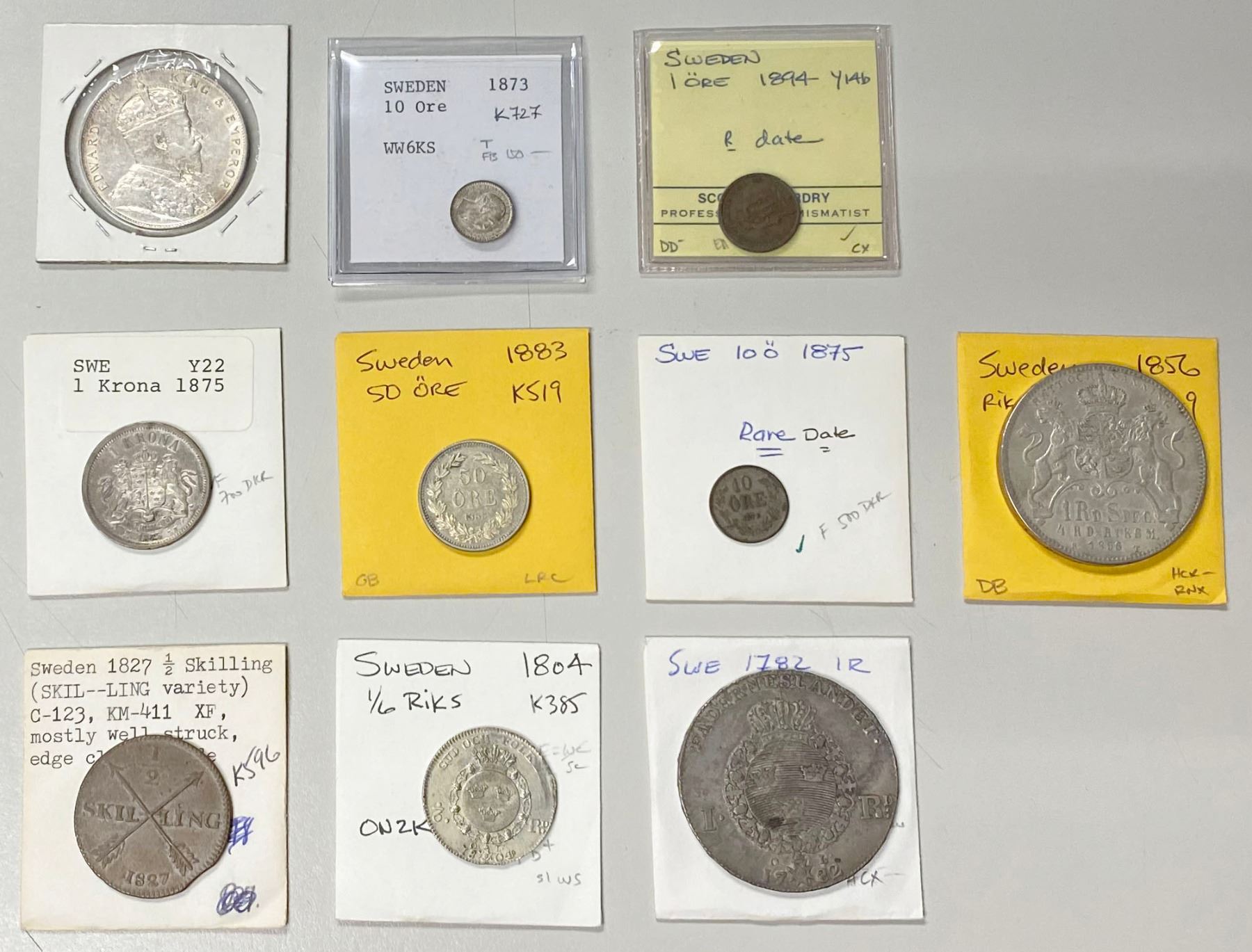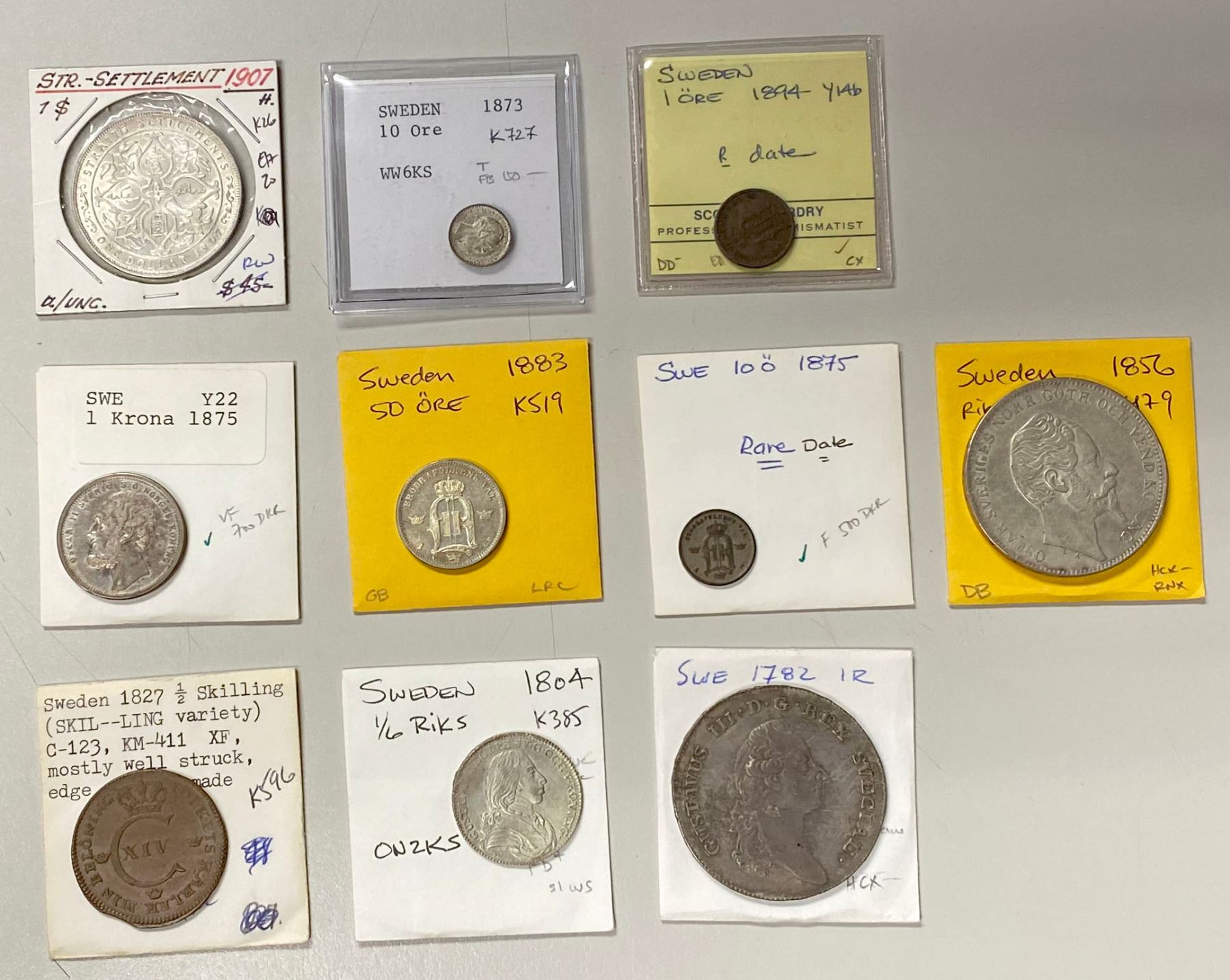 WORLDWIDE: LOT of 10 coins, including Straits Settlements (1 pc, 1907-H dollar) and Sweden (9, 1782 riksdaler, 1804 1/6 riksdaler, 1827 ½ skilling, 1856 riksdaler specie, 1873 10 öre, 1894 öre R, 1875 10 öre R, 1883 50 öre, and 1875 krona); generally better than average circulated grades, all but 2 in silver, many scarce dates and grades here, a quality lot, in consignor's 2x2 holders, viewing recommended; retail value $975, lot of 10 pieces.