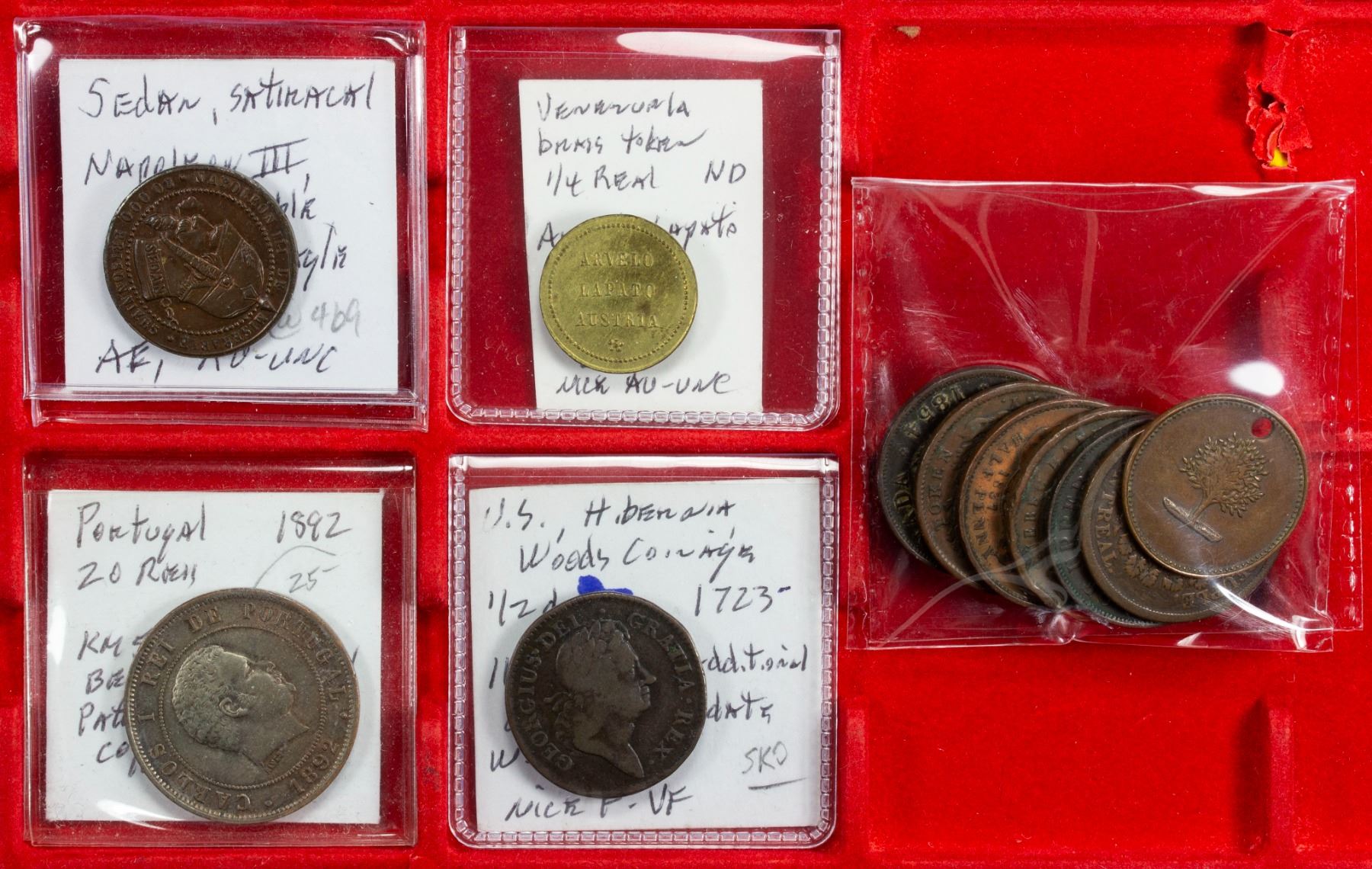 WORLDWIDE: LOT of 11 coins, medals, and tokens, including Canada (6 pcs, AE tokens), France (1, 1870 AE Sedan Satirical medal), Portugal (1, 1892 20 reis), United States (1, Wood's Hibernia halfpenny), Venezuela (1, AE token), and unattributed (1, token, tree // crosshatched field); average circulated grades, with a few better, in consignor's holders, viewing recommended; retail value $200, lot of 11 pieces.