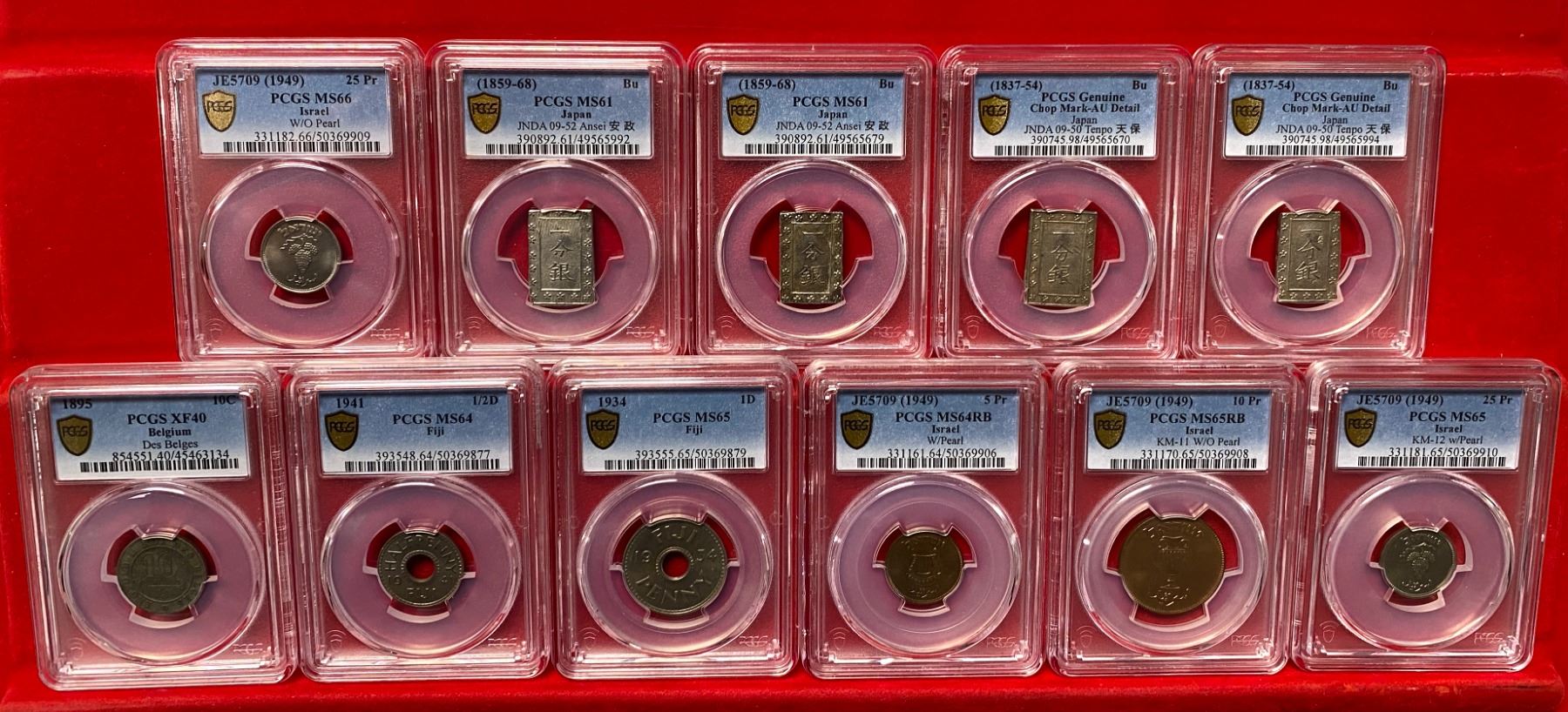 WORLDWIDE: LOT of 11 slabs, all PCGS-certified, including Belgium (1 pc, 1895 French 10 centimes XF40), Fiji (2, 1941 halfpenny MS64 and 1934 penny MS65), Israel (4, JE5709 [1949] with pearl 5 pruta MS64RB, JE5709 [1949] without pearl 10 pruta MS65RB, JE5709 [1949] with pearl 25 pruta MS65, and JE5709 [1949] without pearl 25 pruta MS66), and Japan (4, ND [1837-54] bu AU details-chopmark [2 pcs] and ND [1859-68] bu MS61 [2 pcs]); retail value $650, lot of 11 slabs. The chopmark that PCGS notes on the Tenpo Japan bu's is in fact the incuse character seen on all bu's.