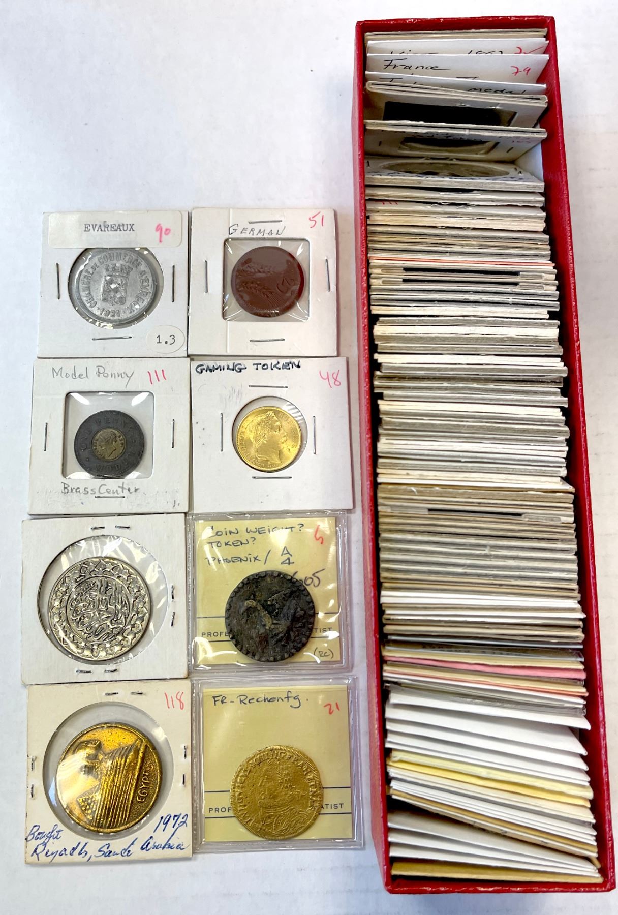WORLDWIDE:LOT of 110 various tokens and coin weights: miscellaneous weights (13 pcs), various tokens and jetons [including Nuremburg, French, pellofas, toy money, temple tokens, Australian, imitation coins (29)], gaming counters (24), French notgeld (18), Conder tokens (5), model coins (6) and some miscellaneous tokens and medals (15); average circulated grades, retail value $1000, lot of 110 items.