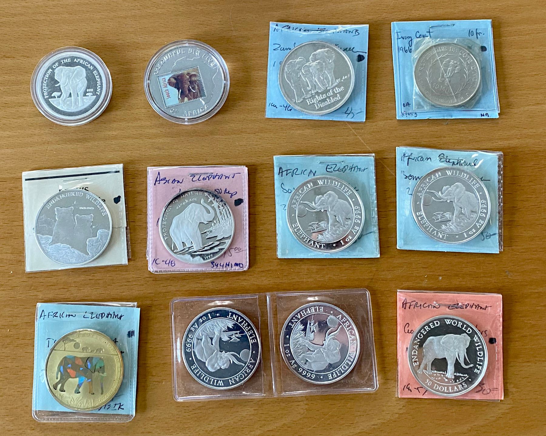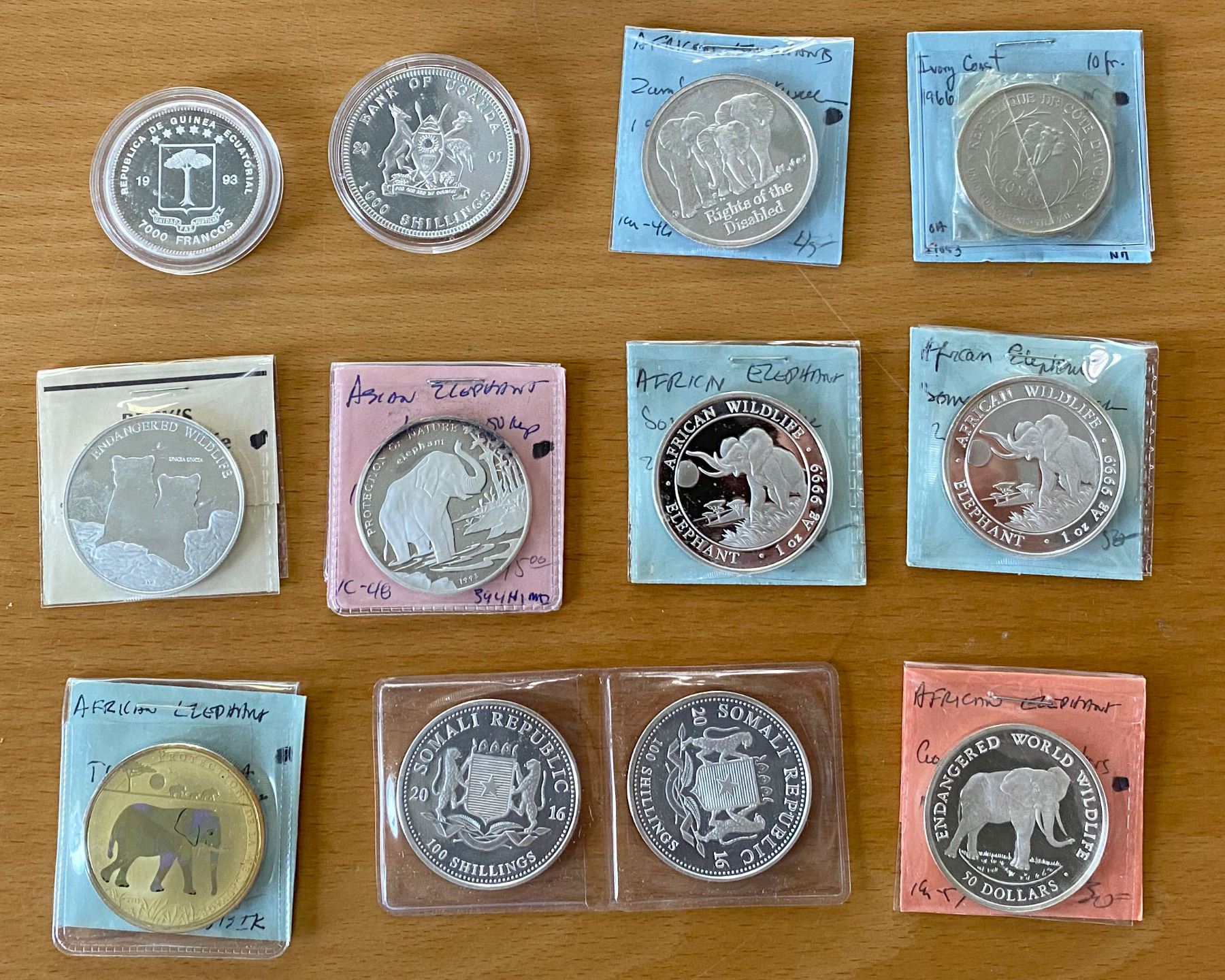 WORLDWIDE: LOT of 12 coins, ASW 8.0604, including Leopard and Elephant coins: Mongolia (1 pc), Ivory Coast (1), Equatorial Guinea (1), Uganda (1), Cook Islands (1), Zambia (1), Somalia (4), Togo (1), and Lao (1); mostly silver proofs, a few base metal, some duplication, but mostly different, in consignor's 2x2 holders or capsules, viewing recommended; retail value $600, lot of 12 items.