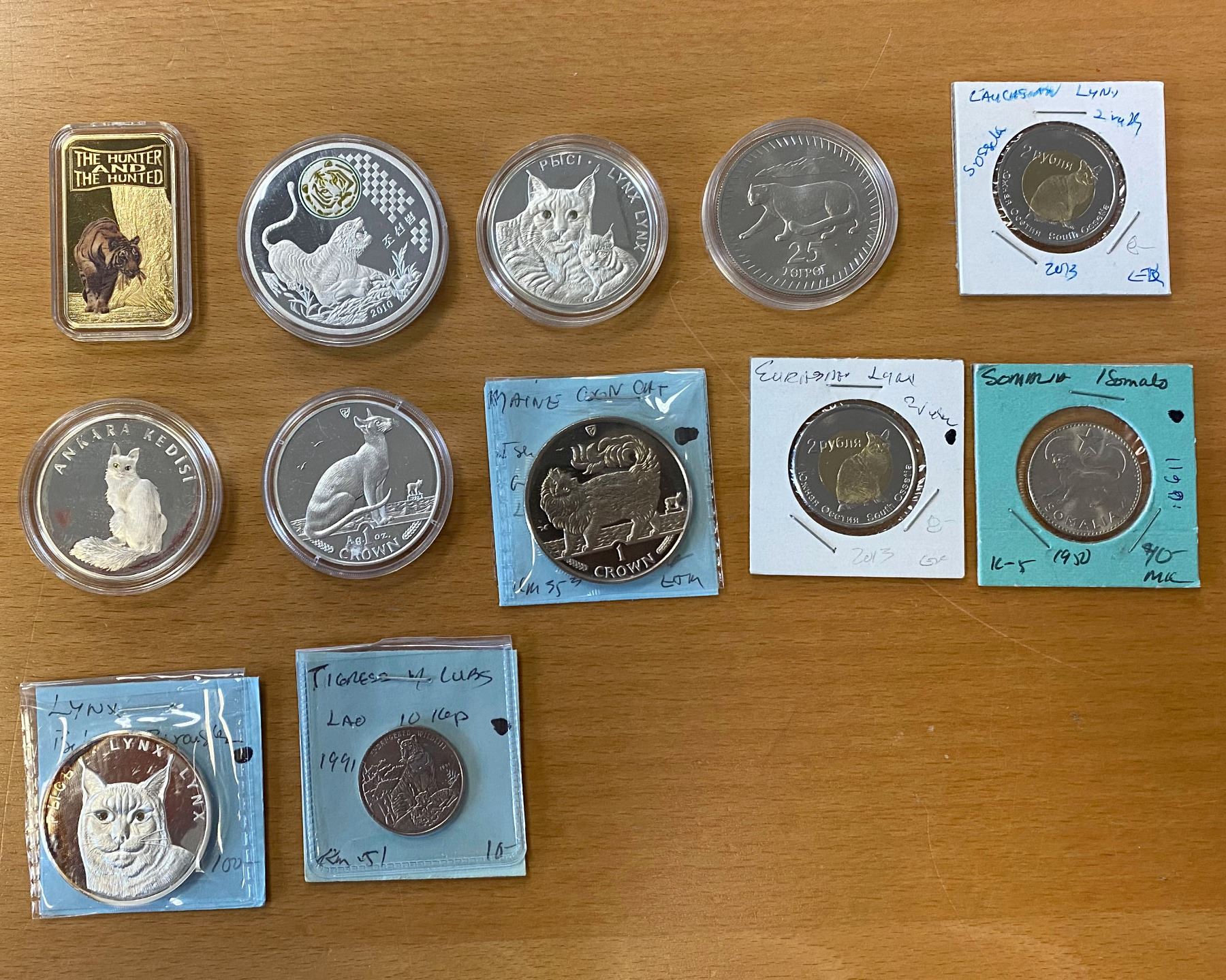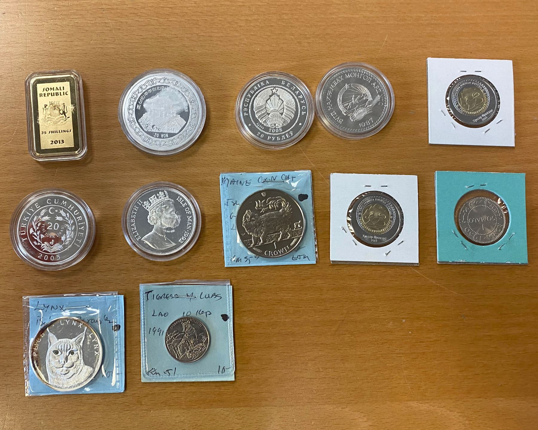 WORLDWIDE: LOT of 12 coins, including Cat coins: Isle of Man (2 pcs), Turkey (1), South Ossetia (2), Somalia (2), Korea/North (1), Lao (1), Mongolia (1), and Belarus (2); some silver proofs, some base metal issues, 1 duplication, but mostly different, in consignor's 2x2 holders or capsules, viewing recommended; retail value $600, lot of 12 items.