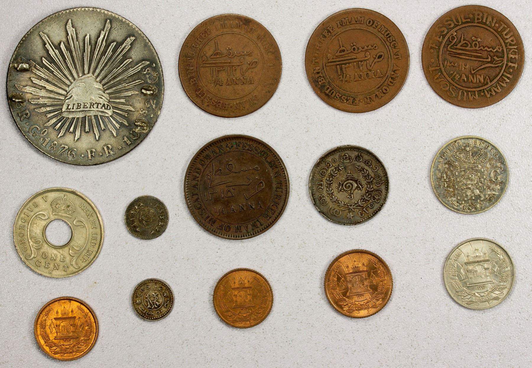WORLDWIDE: LOT of 14 coins, including Afghanistan (4 minors of the SH1316 series, all Unc), India-Travancore (3 silver: AR 1/4 rupee 1889, EF with rim nicks and light cleaning; and two AR 2 chuckrams KM-44 VF-EF & KM-50 EF-AU), Muscat & Oman (4 AE ¼ anna: three dated AH1312 and one AH1315; all different types; VF to EF conditions), and one each from British East Africa (1 cent 1920-H, EF), Netherland East Indies (AR 1/4 gulden 1858, EF+), and Mexico (obverse-enameled AR 8 reales 1876-Go, solder marks on reverse); retail value $400, lot of 14 pieces.