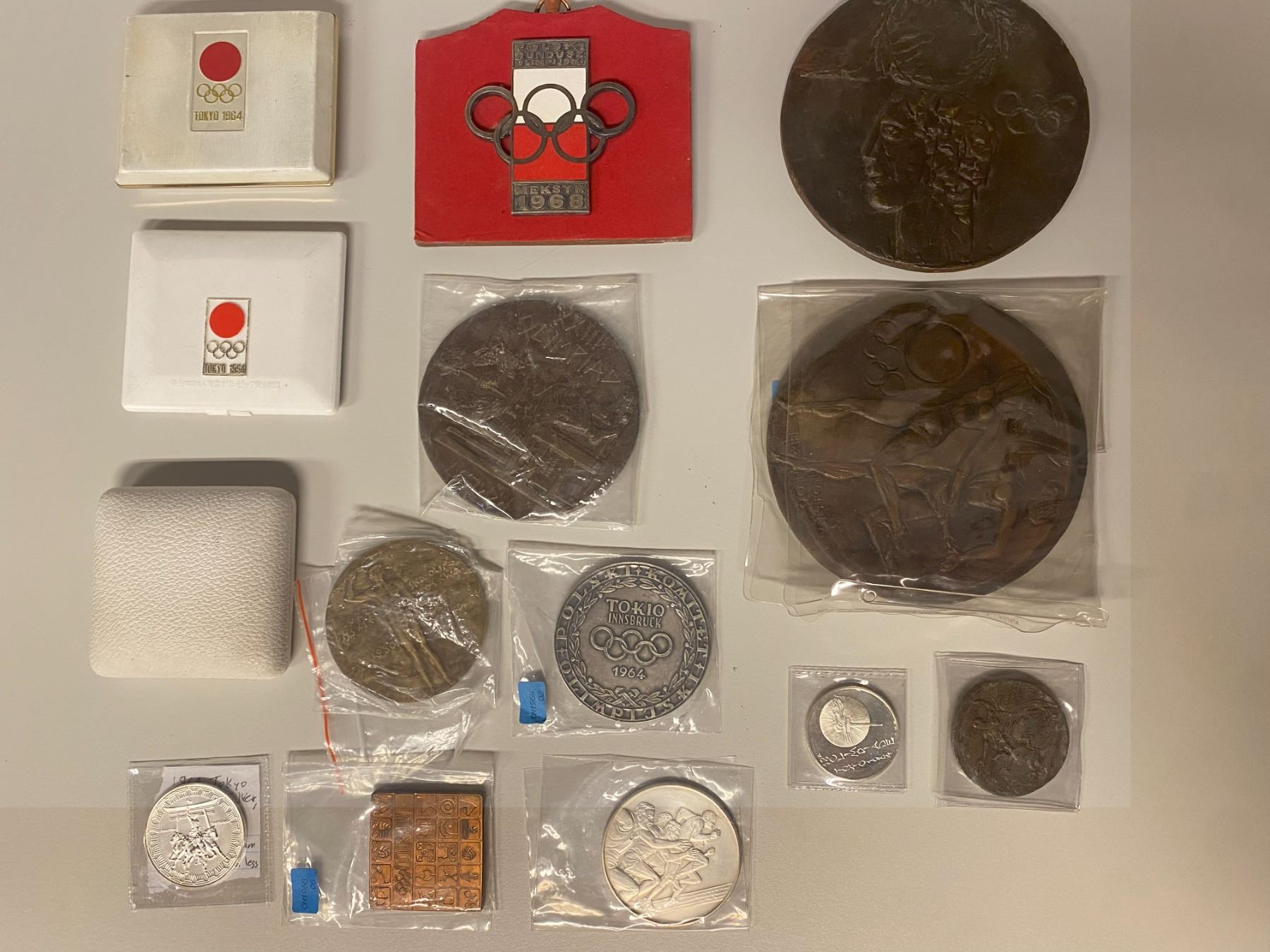 WORLDWIDE: LOT of 14 medals and related items, including Greece: 1896 Athens AE Participant's Medal (bent with digs); Japan: 1964 Tokyo AR 65mm Chariot and Torchbearer (in case), 1964 Tokyo AR 45mm Chariot and Torchbearer, 1964 Tokyo AR and AE 30mm Sprinters (in case, missing gold), 1964 Tokyo gilt AE 60mm Torch Relay//Sendagaya Gate (in case), 1964 Tokyo AR 60mm Sprinters//Torch and Rings, 1964 Tokyo AR 40mm Torch and Sun//Mt. Fuji; Mexico: 1968 Mexico City AE 50x50mm plaque Sport Symbols; Poland: 1964 silvered AE 70mm Torchbearer//Olympic Rings, 1968 Mexico City wood and base metal 109x127mm wall plaque Olympic Fund; 1980 Lake Placid AE 71mm Nude Man//Olympic Rings, and ND AE 139mm 4x100 Relay; United States: 1980 Moskow AE 102mm Zeus with Victory//Pentathlon; and Unattributed: ND AE 137mm Discus Thrower// Laurel Crowning and Olympic Rings; most are unc or lightly circulated, a few have been lightly cleaned, in consignor's holders and official cases, viewing recommended; retail value $600, lot of 14 items.