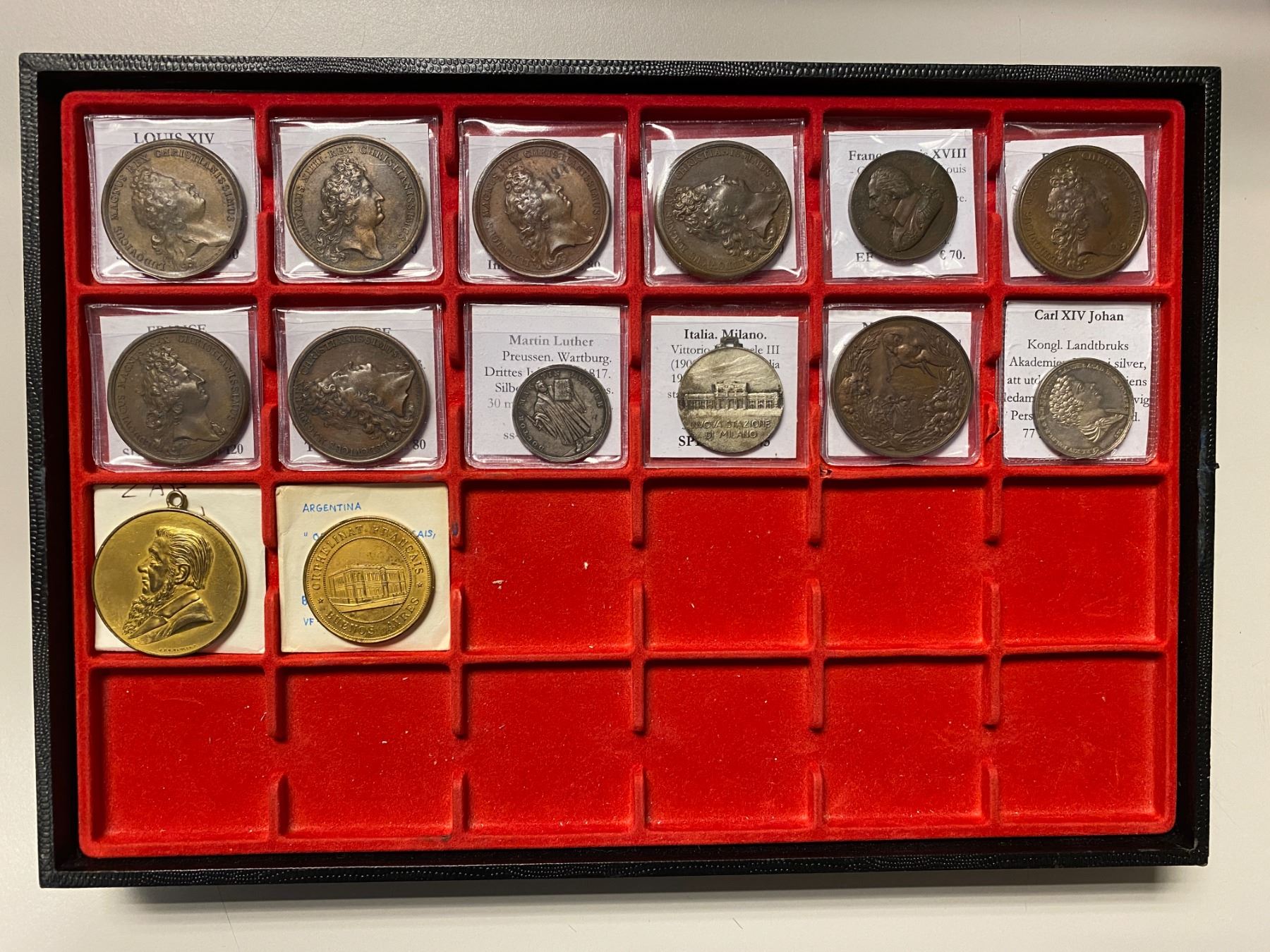 WORLDWIDE: LOT of 14 medals, including Argentina (1 pc, 1899 AE 38mm Orphelinat Français), France (8, 1672 AE 41mm Campaign of Holland, 1675 AE 41mm Relief of Messina, 1680 AE 41mm Port of Toulon, 1680 AE 41mm Chateau of Versailles [with museum number], 1688 AE 41mm Capture of Philippsbourg, 1693 AE 41mm Distinction of Sailors, 1703 AE 41mm Capture of Brisach, and 1816 AE 33mm Consecration of Louis XVI and Marie Antoinette Burial Place), German States/Prussia (1, 1817 AR 30mm Martin Luther-Wartburg Third Centennial of Reformation), Italy/Milan (1, 1931 silvered AE 32mm Inauguration of the Milan Railway Station), Netherlands (1, 1888 AE 43mm Anniversary of Natura Artis Magistra-animals), South Africa/ZAR (1, 1899 gilt AE Glory of Soldiers' Deeds), and Sweden (1, ND AR 31mm Royal Academy of Agricultural Sciences); average circulated grades, with many better, in consignor's 2x2 holders, viewing recommended; retail value $875, lot of 14 medals.
