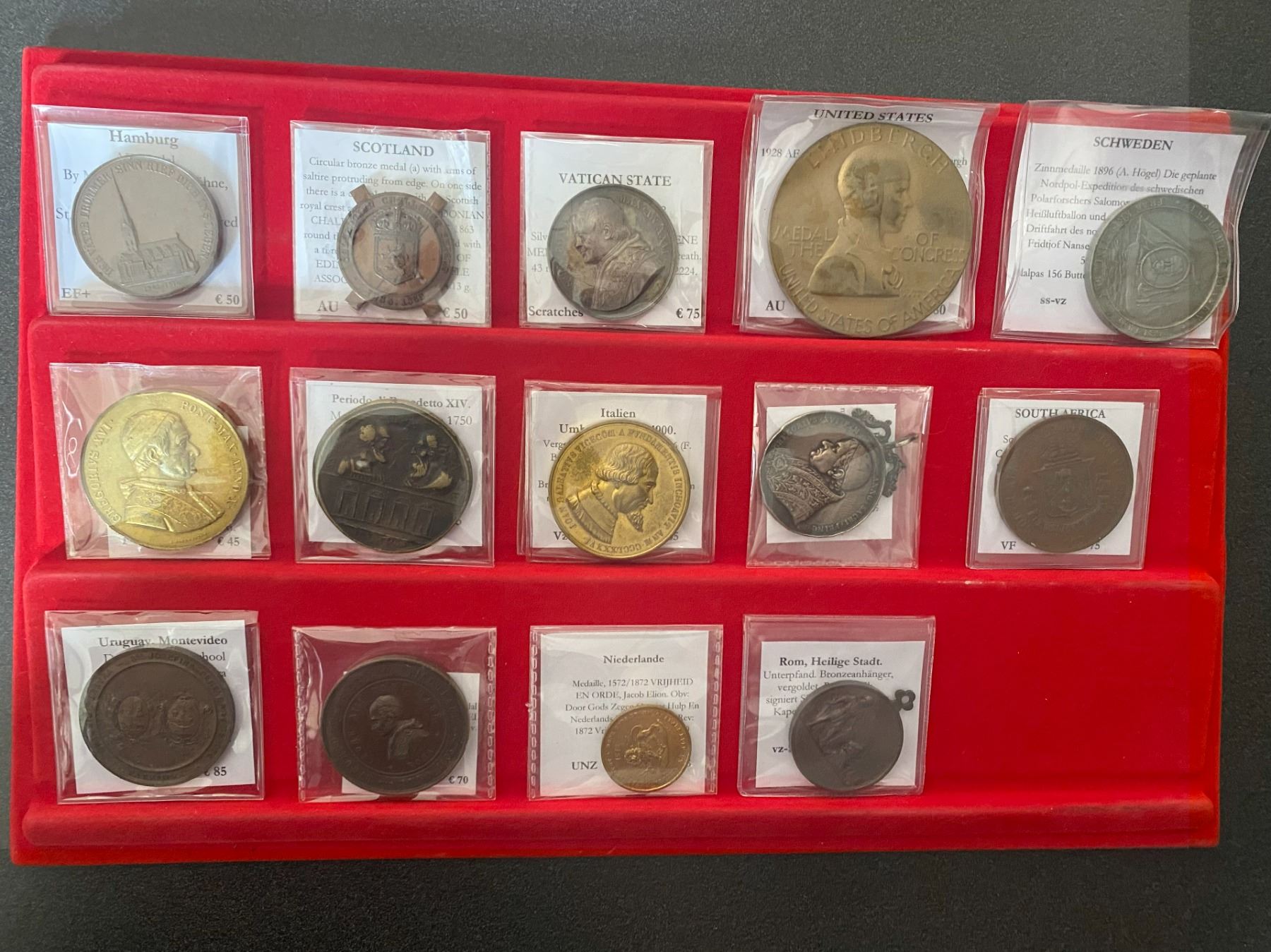 WORLDWIDE: LOT of 15 medals, including German States/Hamburg: 1842 AE 44mm St. Peter's Church; Great Britain/Scotland: 1861 AE 37mm Caledonian Challenge Shield; Italian States/Papal States: ND (1871) AR 43mm Merit Award Medal, ND (ca. 1870?) AE 38mm Chapel Tre Fontane, ND (1840) AR 43mm Construction of New Public Buildings, 1893 AE 47mm Church of Santo Gioachimo, 1840 gilt AE 50mm Society Institutes for Faith, and ND (1750) AE Jesus, Mary, and Apostles (2 pcs, 49mm and 45mm); Italy: 1886 gilt AE 500th Anniversary of Milan Cathedral; Netherlands: 1872 AE 30mm Freedom and Order; South Africa: 1885 AE 48mm South African Exhibition at the Cape of Good Hope; Sweden: 1896 white metal 50mm Polar Expedition; United States: 1928 AE 69mm Charles Lindbergh by Laura Gardin Fraser; and Uruguay: 1896 AE 45mm Don Bosco School; average circulated grades, with some better, in consignor's attributed holders, viewing recommended; retail value $675, lot of 15 medals .