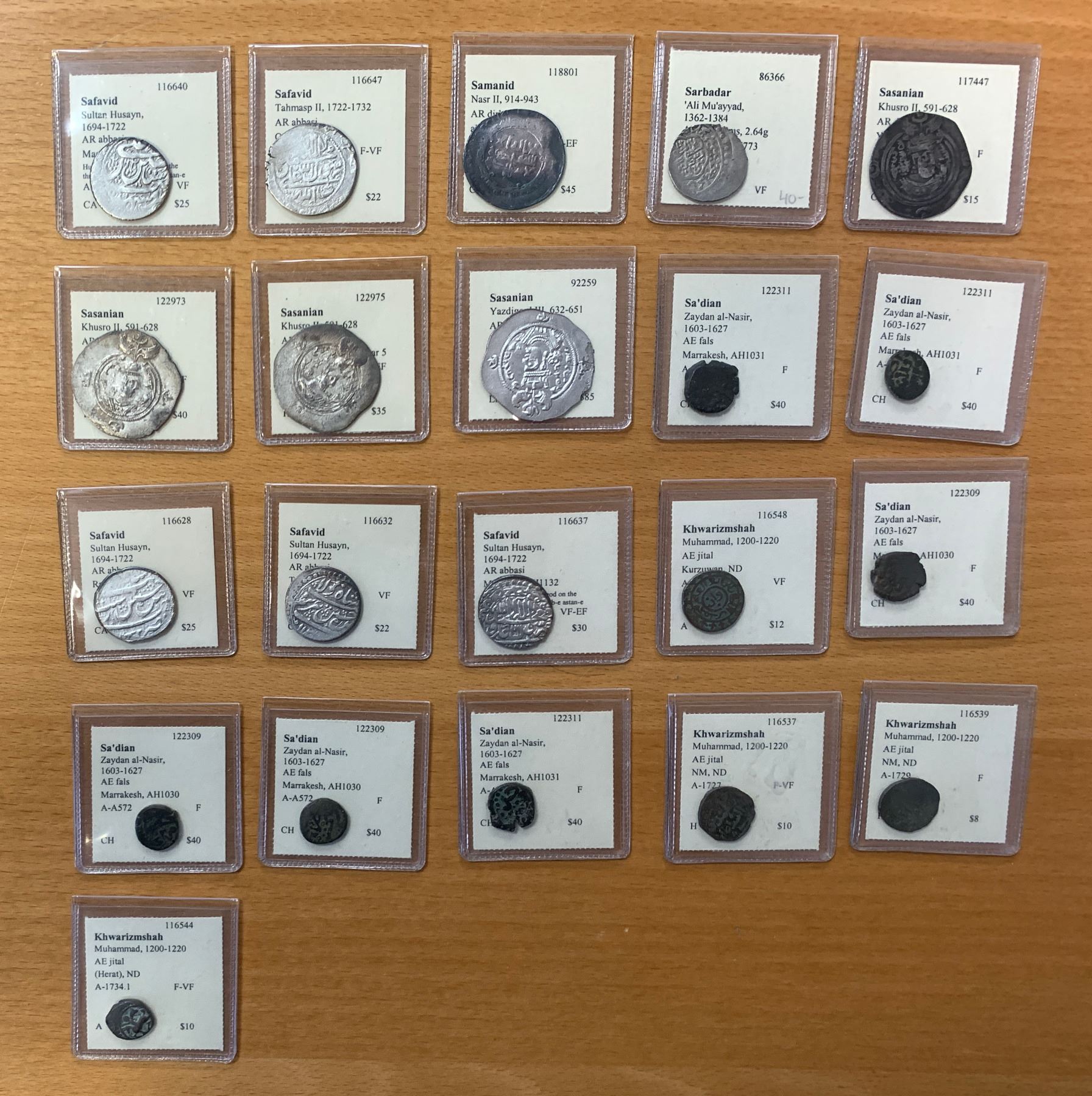 WORLDWIDE:LOT of 21 Islamic coins, including Khwarizmshah (4 pcs), Sa'dian (6), Safavid (5), Samanid (1), Sarbadar (1), and Sasanian (4); average circulated grades, many silver, in our 2x2 holders; retail value $675, lot of 21 pieces.