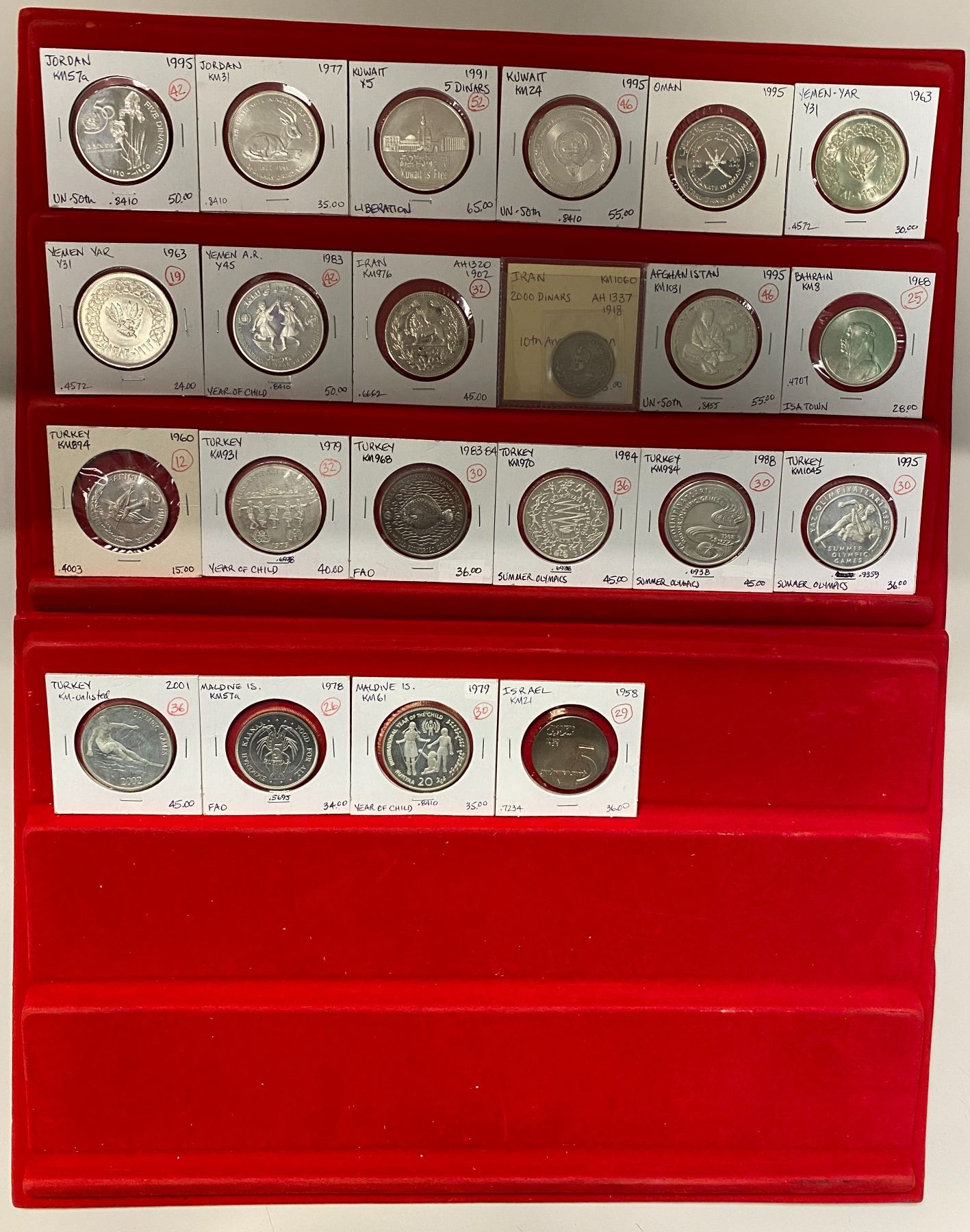 WORLDWIDE: LOT of 22 coins, including Maldives (2), Turkey (7), Bahrain, Afhanistan, Iran (2), Yemen (3), Oman, Kuwait (2), Jordan (2), and Israel, the majority of which are silver; retail value $700, lot of 22 pieces.