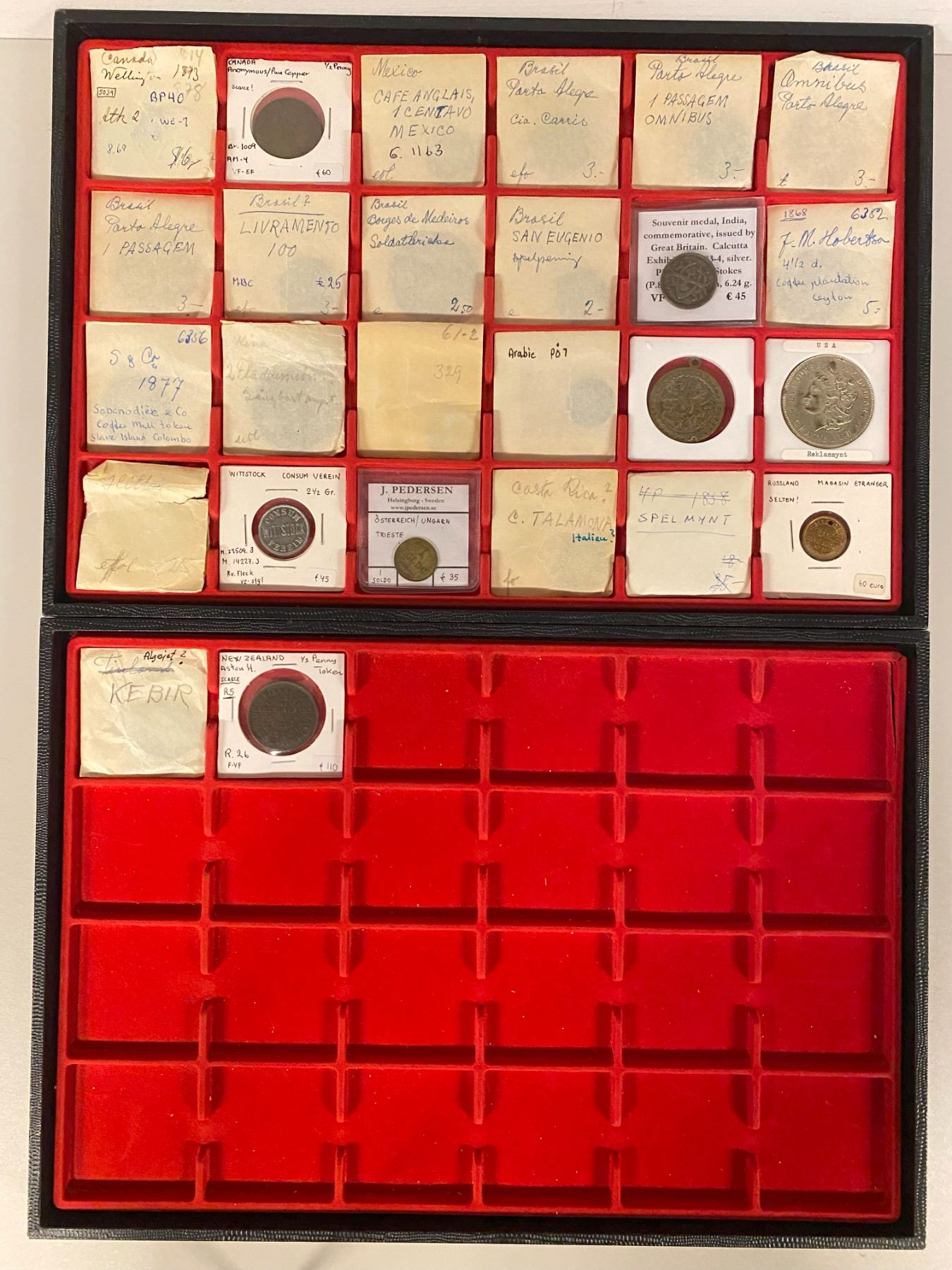 WORLDWIDE: LOT of 31 items, including Americas (10): Canada (2 half pennies: "pure copper" AM-4; Wellington 1813 We-7), Mexico (1 Cafe Anglais 1¢), Brazil (7: three various in brass, plus four plastic bus transit tokens of Porto Alegre); Asia (7): Ceylon (2 plantation chits: Ambewatte Mills 1877; J. M. Robertson Colombo), India (1 silver souvenir medal for the 1883-4 Calcutta Exhibition, holed), Iran (3 religious tokens), Korea (1 charm); Europe (11): France (1 Châtelet - La Course aux Dollars, in the design of a Morgan Dollar), Germany (2), Italy (3, incl. a soldo of Austrian Trieste), Russian Empire (1 5-jetons for the Magasin Etranger in St. Petersburg, BU holed), and a set of 4 BU jetons (different animal obverses); plus Algeria (2 Kebir tokens) and New Zealand (1 A. Ashton halfpenny 1859, R-26); various conditions; retail value $500, lot of 31 pieces.