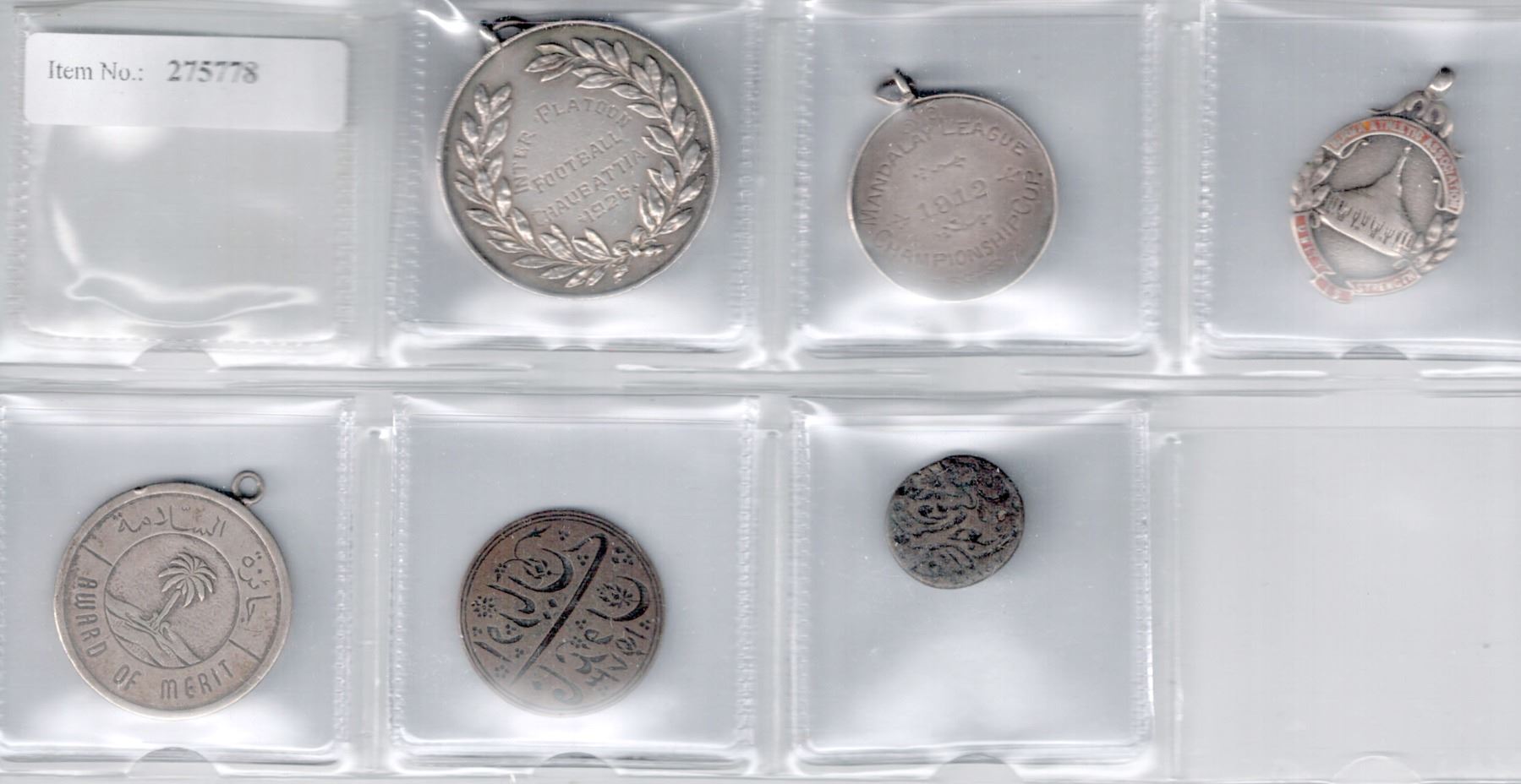 WORLDWIDE: LOT of 4 medals & 2 carved seals, including 1) 39mm engraved AR medal for Inter Platoon Football in Chaubattia (northern India) in 1926; 2) 28mm engraved AR medal for Mandalay League Championship in 1912 // peacock above UBAA (Upper Burma Athletic Assoc.); 3) 31mm silver & enamel medal for Junior Football Challenge Cup of the Burma Athletic Assoc. in 1915 (won by Pte P. H. Fooks of 2-5 Somersets LI, Rangoon); 4) 33mm undated merit medal in English & Arabic; 5) 28mm AE personal seal engraved with the name Adrian (second word unread) in Nasta`liq calligraphy, dated 1873; 6) 19mm AE seal in Nasta`liq; average conditions or better, retail value $325, lot of 6 pieces.