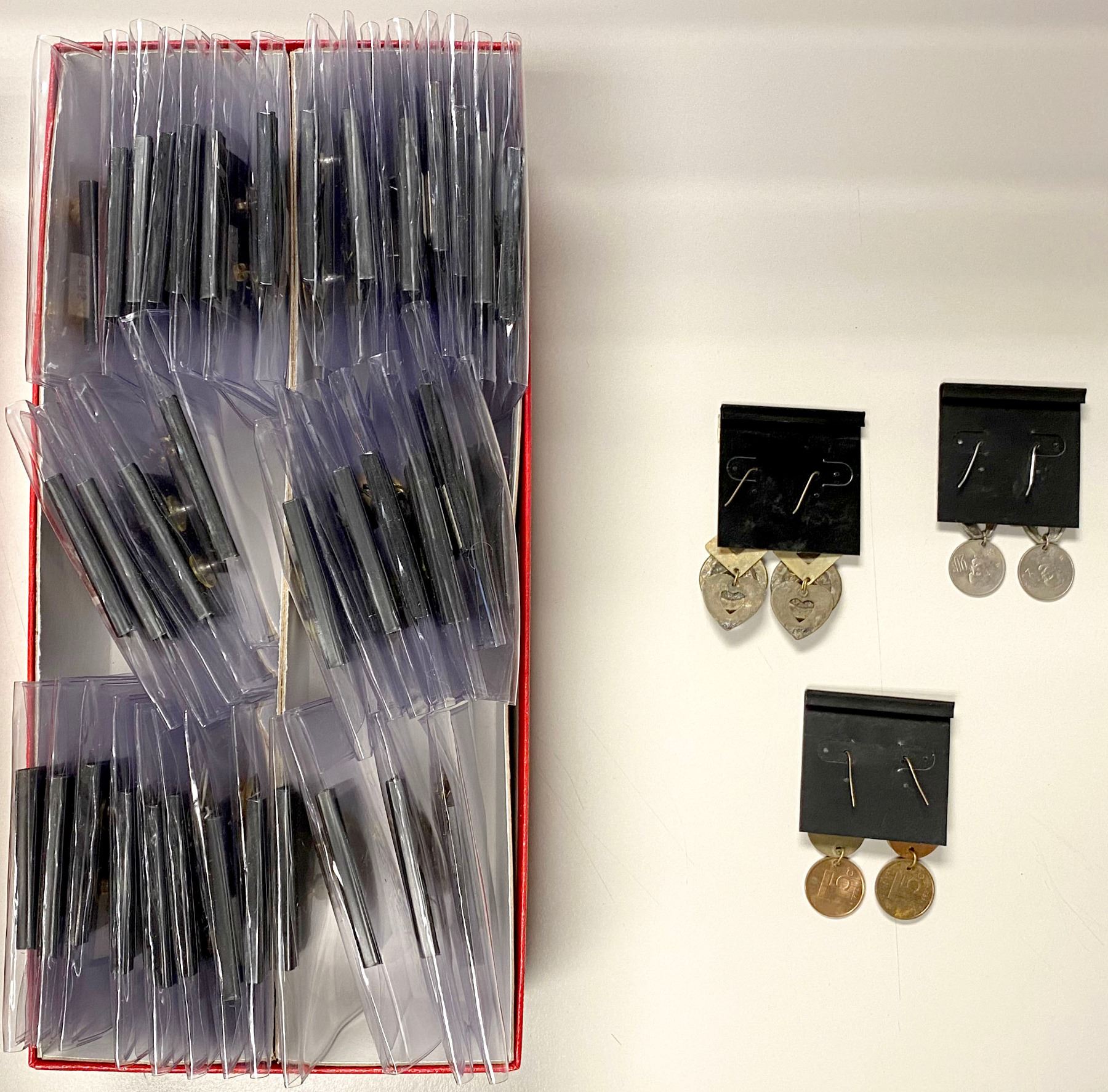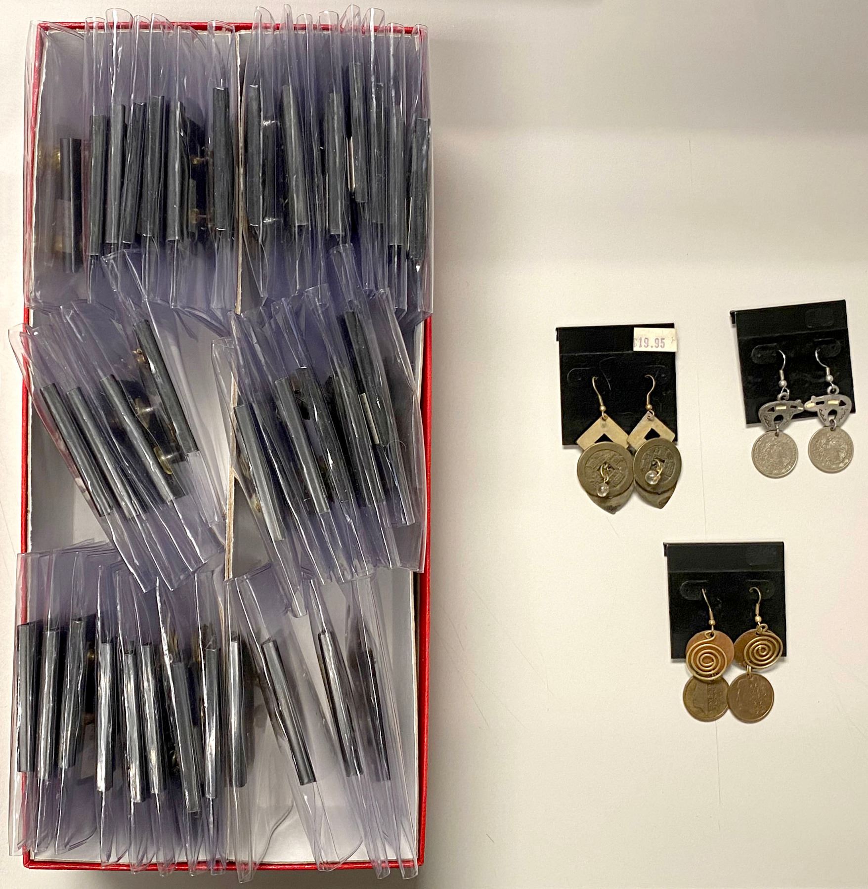 WORLDWIDE: LOT of 41 coin jewelry earring pairs, from a San Diego, California based artist, handmade earrings created using a wide variety of coins, a very interesting lot, retail value $500, lot of 41 items.