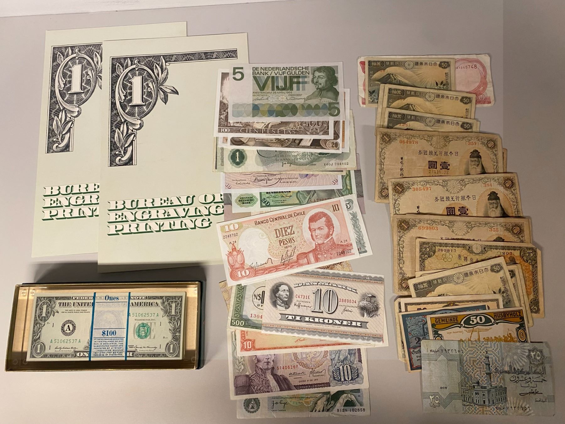 WORLDWIDE: LOT of 58 items, including "$100" paperweight with 1969 United States Federal Reserve $1 on the face and back with faux notes between and all encased in lucite, 1985 United States $1 Federal Reserve Note 4-subject uncut sheet (2 sheets, with original folder and information), and 55 assorted world banknotes (including some exchangable); average circulated grades, as well as many uncs, viewing recommended; retail value $275, lot of 58 items.