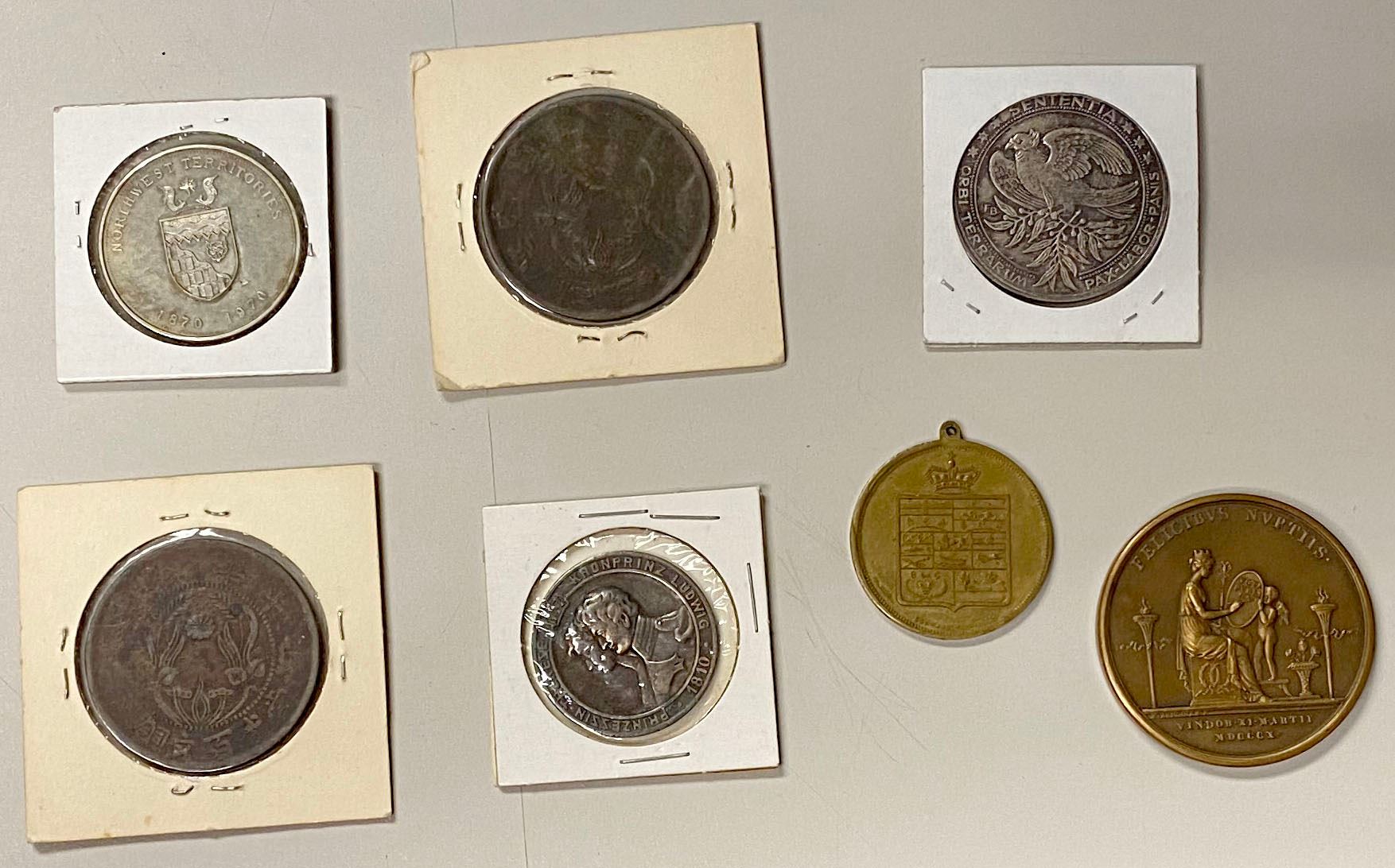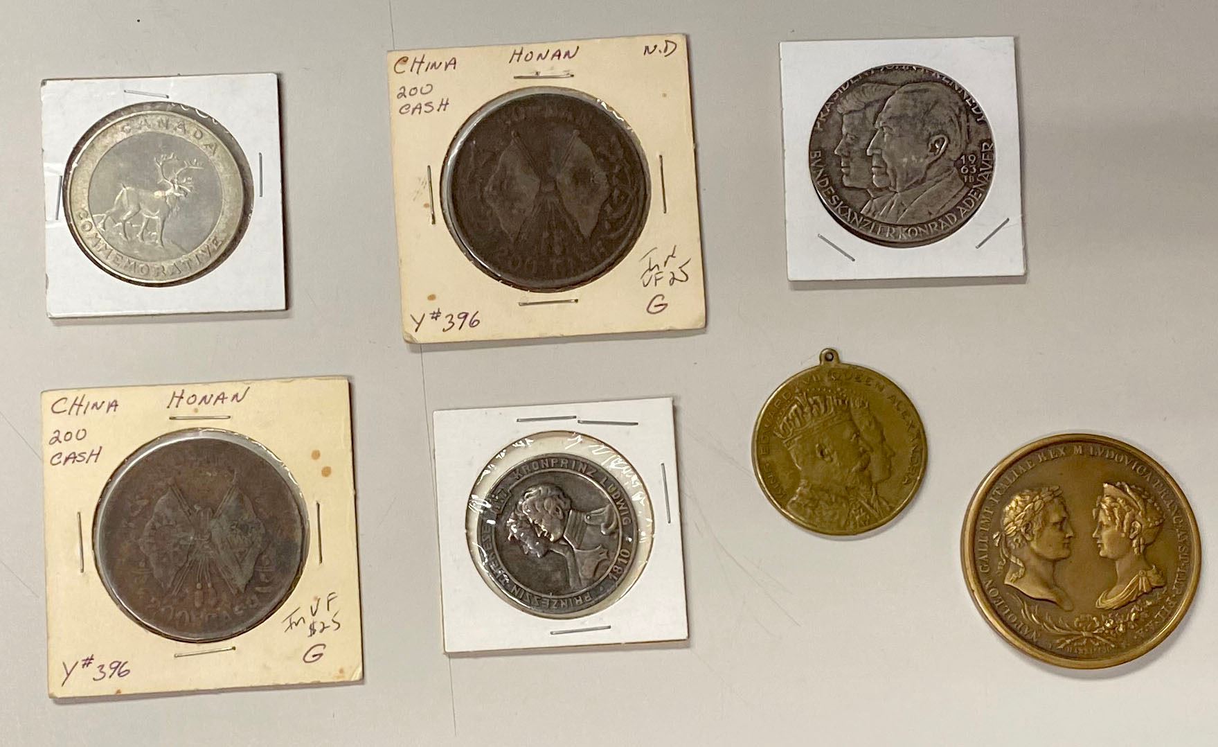 WORLDWIDE: LOT of 7 coins and medals, including 1970 Canada Northwest Territories medal, ND China/Honan 200 cash (2 pcs) (1810) France AE Marriage of Napoleon and Marie Louise (restrike), 1910 German States/Bavaria AR 100th Anniversary of Oktoberfest, 1963 Germany AR Meeting of Adenauer and Kennedy in Berlin, and (1902) Canada brass Edward VII Coronation medal; average circulated grades, with some better, in consignor's holders, viewing recommended; retail value $180, lot of 7 pieces.