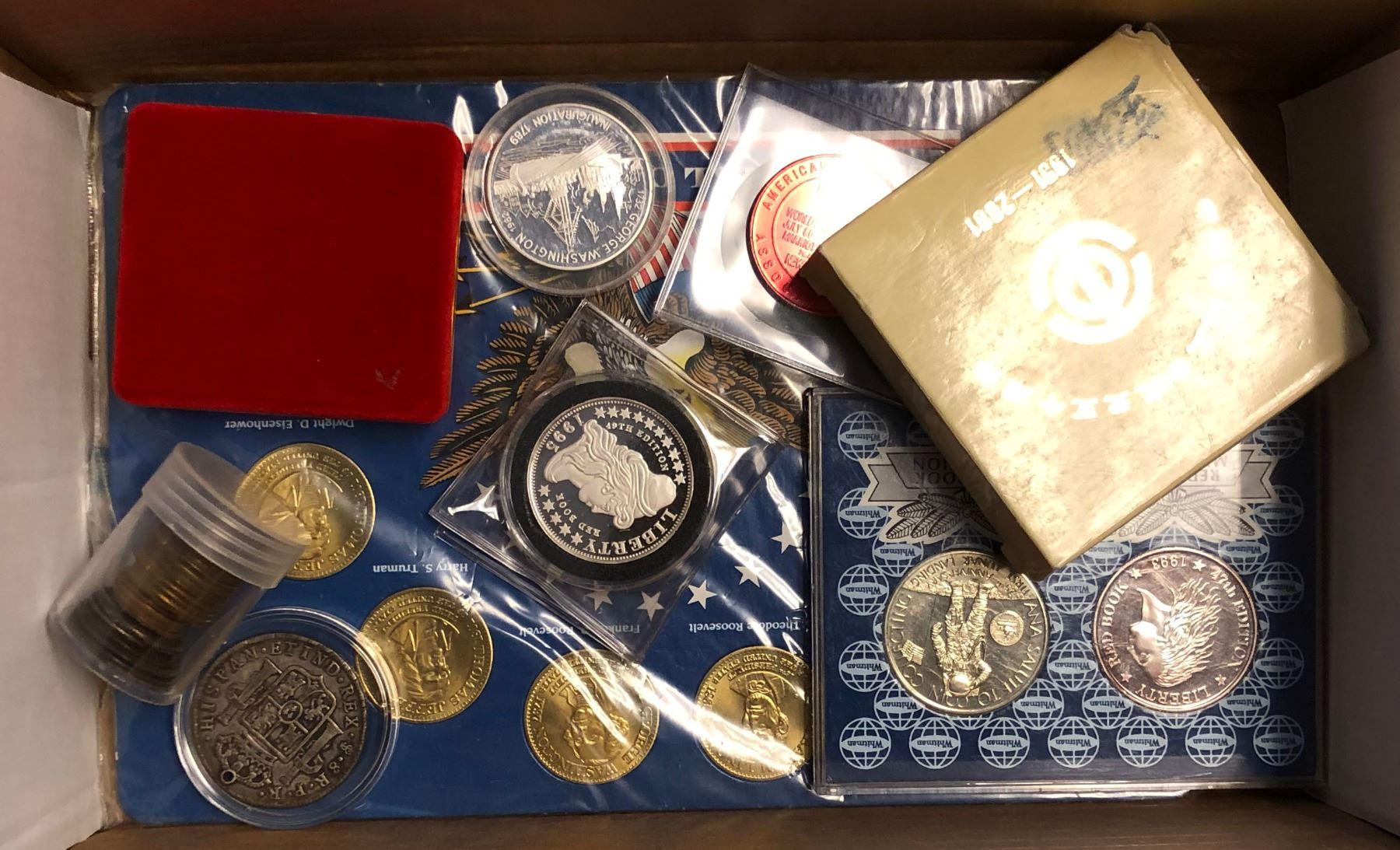 WORLDWIDE:LOT of 77 diverse coins including: United States Shell Oil Presidential Collector coins (40); ANA Mardi Gras token; "The Hog Ranch" token; 1995 and 1993 Whitman Publishing silver one ounce rounds (2); plus tokens from New Hampshire and misc other coins (28); Turks and Caicos 5 crowns 1994 Anniversary of the Apollo XI Mission; Antigua and Barbuda silver 30 dollars 1982 Anniversary of the Birth of George Washington; Bolivia silver 8 reales, 1777 holed; Portuguese language silver medal 1982-2002 in case of issue; China silver medal 1951-2001 in original case of issue; retail value $150, lot of 77 items.