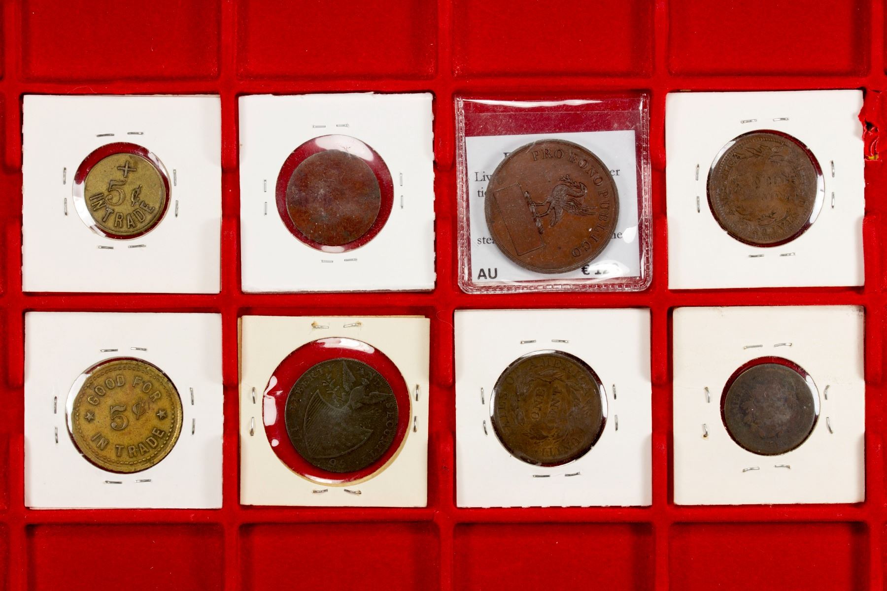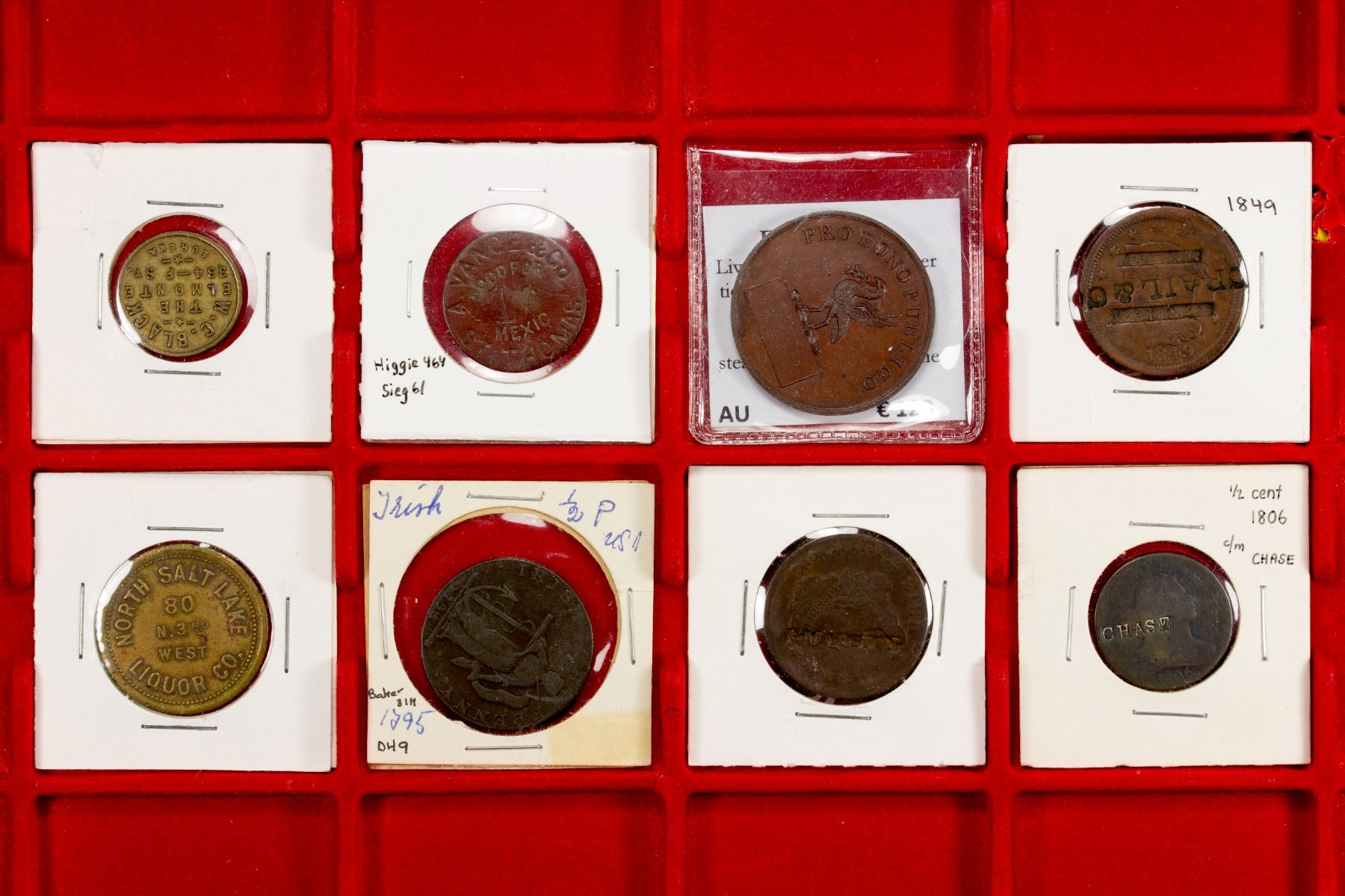 WORLDWIDE: LOT of 8 tokens, including Danish West Indies (1 pc, A. Vance & Co., St. Thomas), Great Britain (1, 1817 AE Etna passenger ticket), Ireland (1, Dublin halfpenny with U.S. Liberty and Security reverse, DH-9), and United States (5, including 3 merchant countermarks on early half and one cents and two merchant tokens, one from California and another from Utah); average circulated grades, with a couple better, in consignor's 2x2 holders, viewing recommended; retail value $425, lot of 8 tokens.