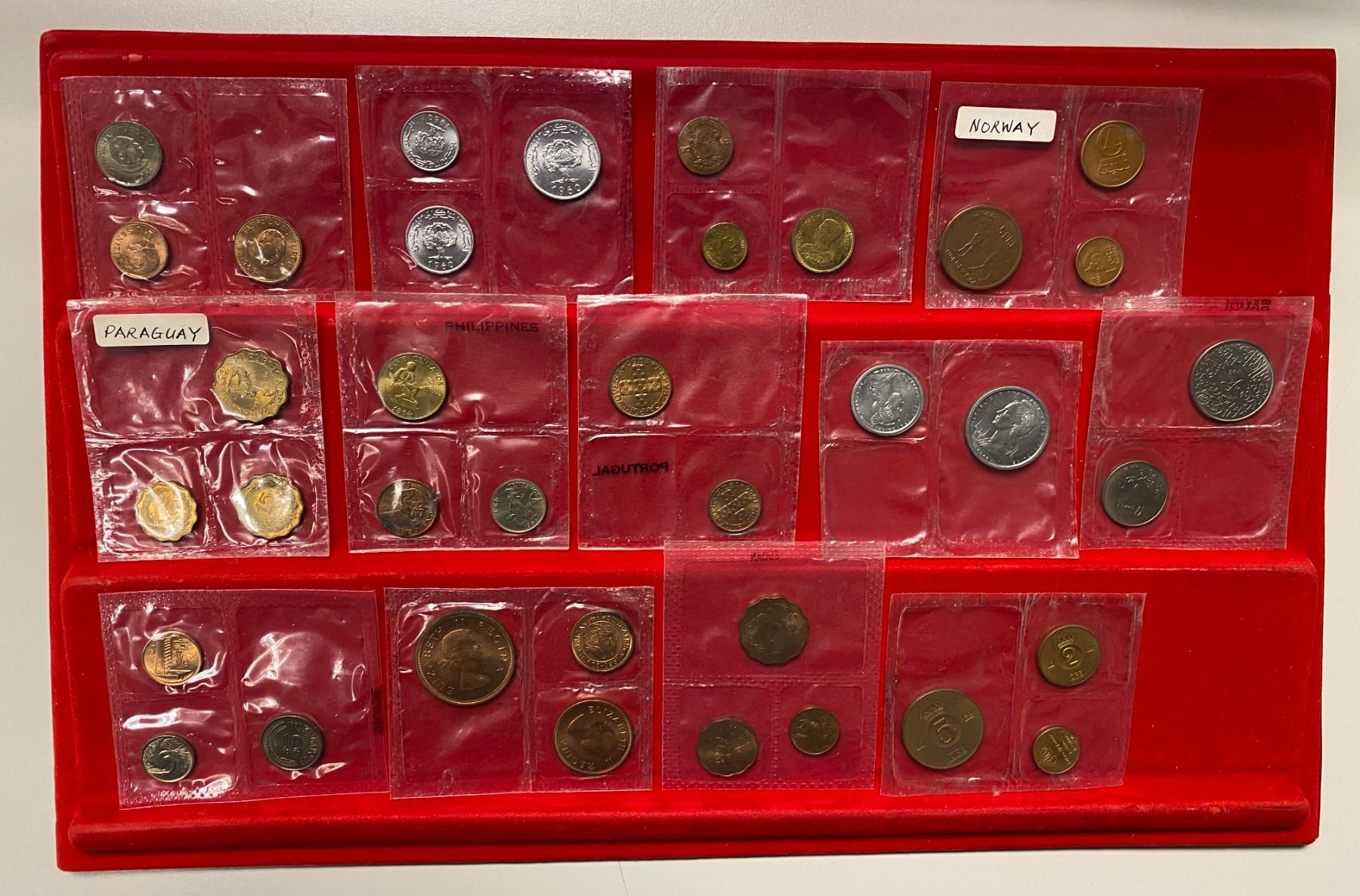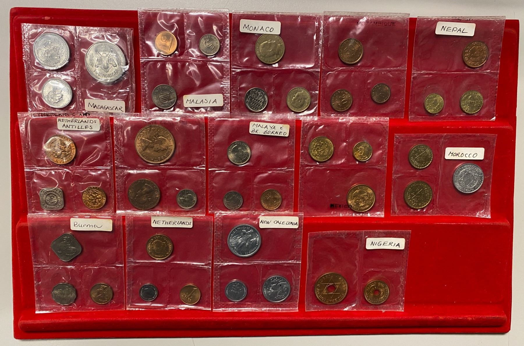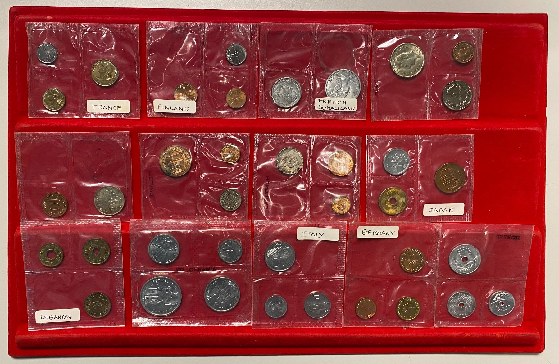 WORLDWIDE: LOT of 86 sets, sets of circulation coinage by country, in pliofilm, including Algeria, Angola, Argentina, Bulgaria, Cameroon, China (Taiwan), East Africa, French Oceania, Ghana, Greece, Guatamala, Honduras, Hungary, Korea/South, Kuwait, Lebanon, Macao, Malaya and British Borneo, Monaco, Myanmar, New Caledonia, Nigeria, Pakistan, Philippines, St. Pierre and Miquelon, Somalia, South Arabia, Sudan, Syria, Tanzania, Turkey, West African States, etc., etc.; almost all are unc, from the 1950s and 60s, mostly 3- and 4-coin sets, in wooden box, viewing recommended; retail value $500, lot of 86 sets.